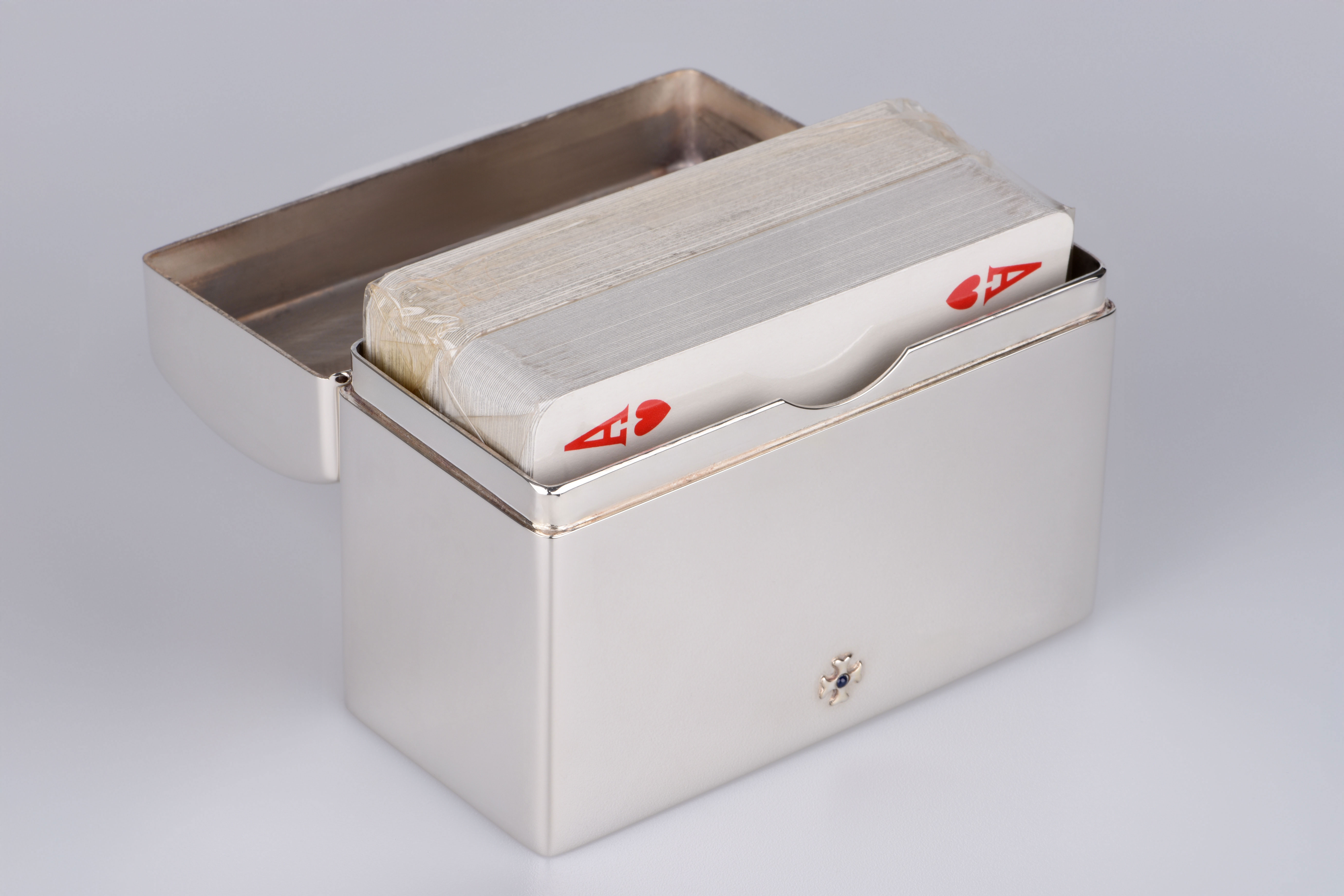 Die exklusive Bridgekarten Box von Sillem´s vereint klassische Schönheit mit zeitloser Funktionalität. Gefertigt aus edlem Sterling Silber ist dieses Sammlerstück nicht nur ein Spielaccessoire, sondern zugleich ein Ausdruck vollendeter Lebensart.