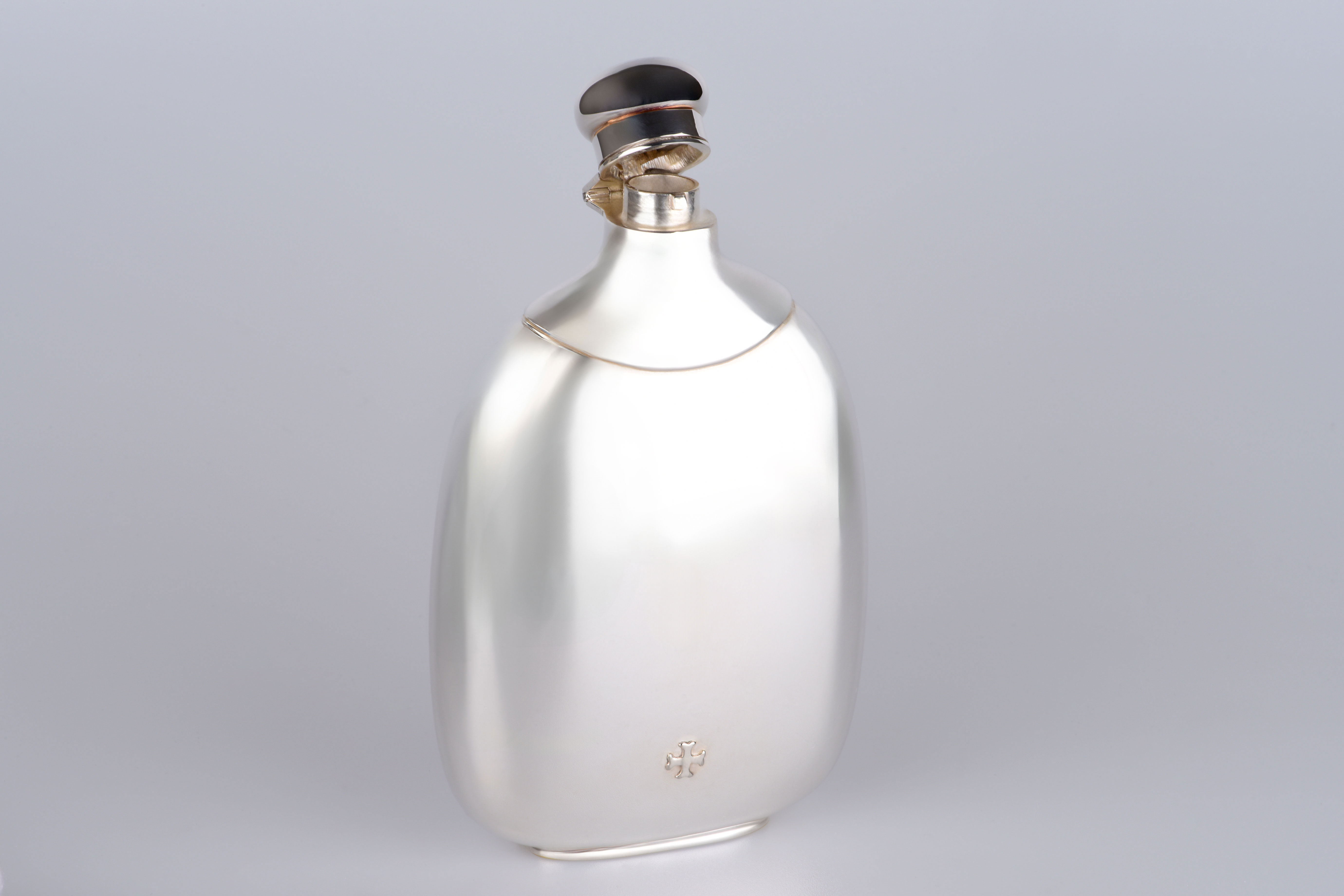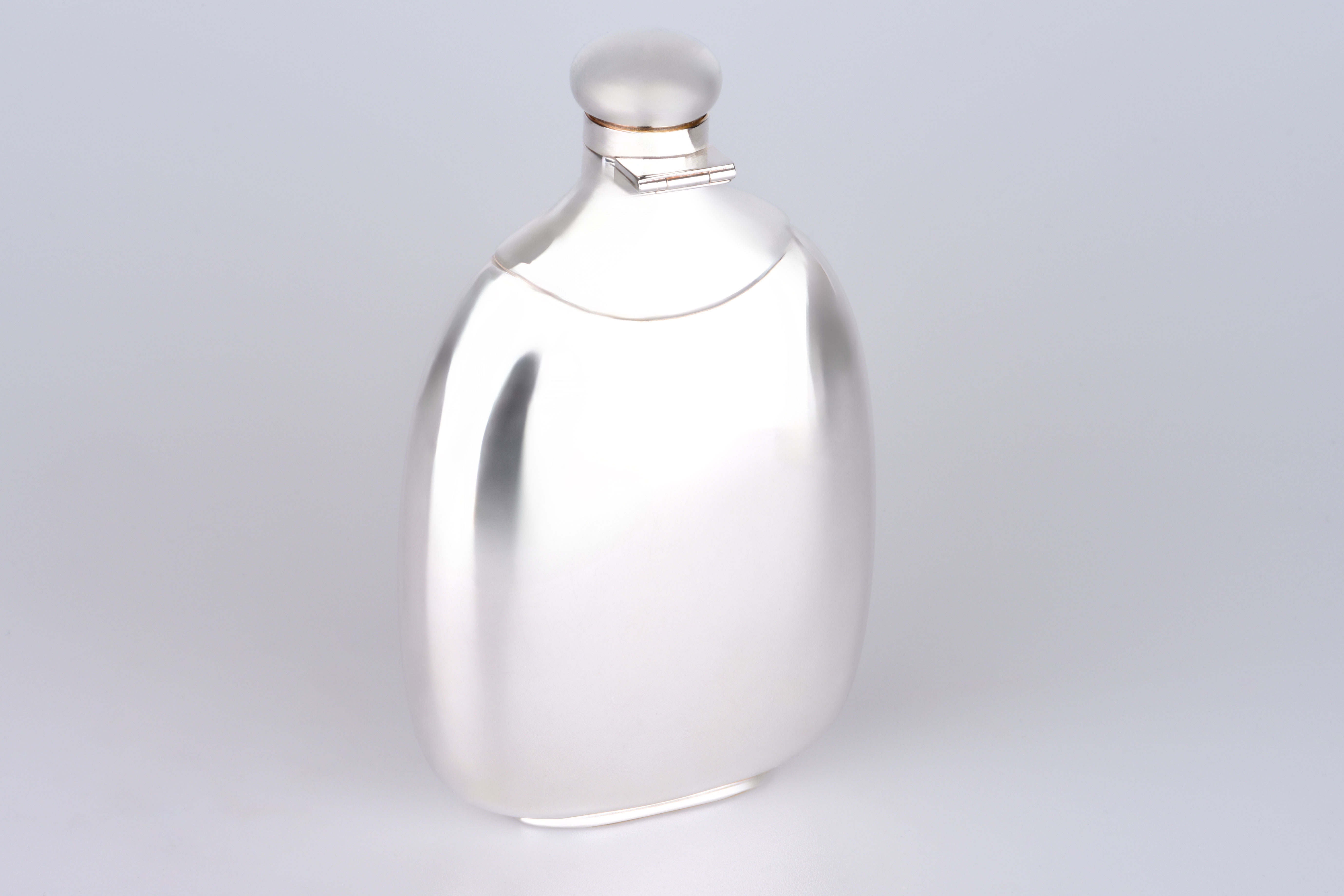 Der glänzende Silberüberzug verleiht dem Flachmann eine luxuriöse Note, während die präzise Verarbeitung für höchste Qualität und Langlebigkeit steht. Dank seiner eleganten Linienführung liegt er perfekt in der Hand und passt mühelos in jede Tasche.
