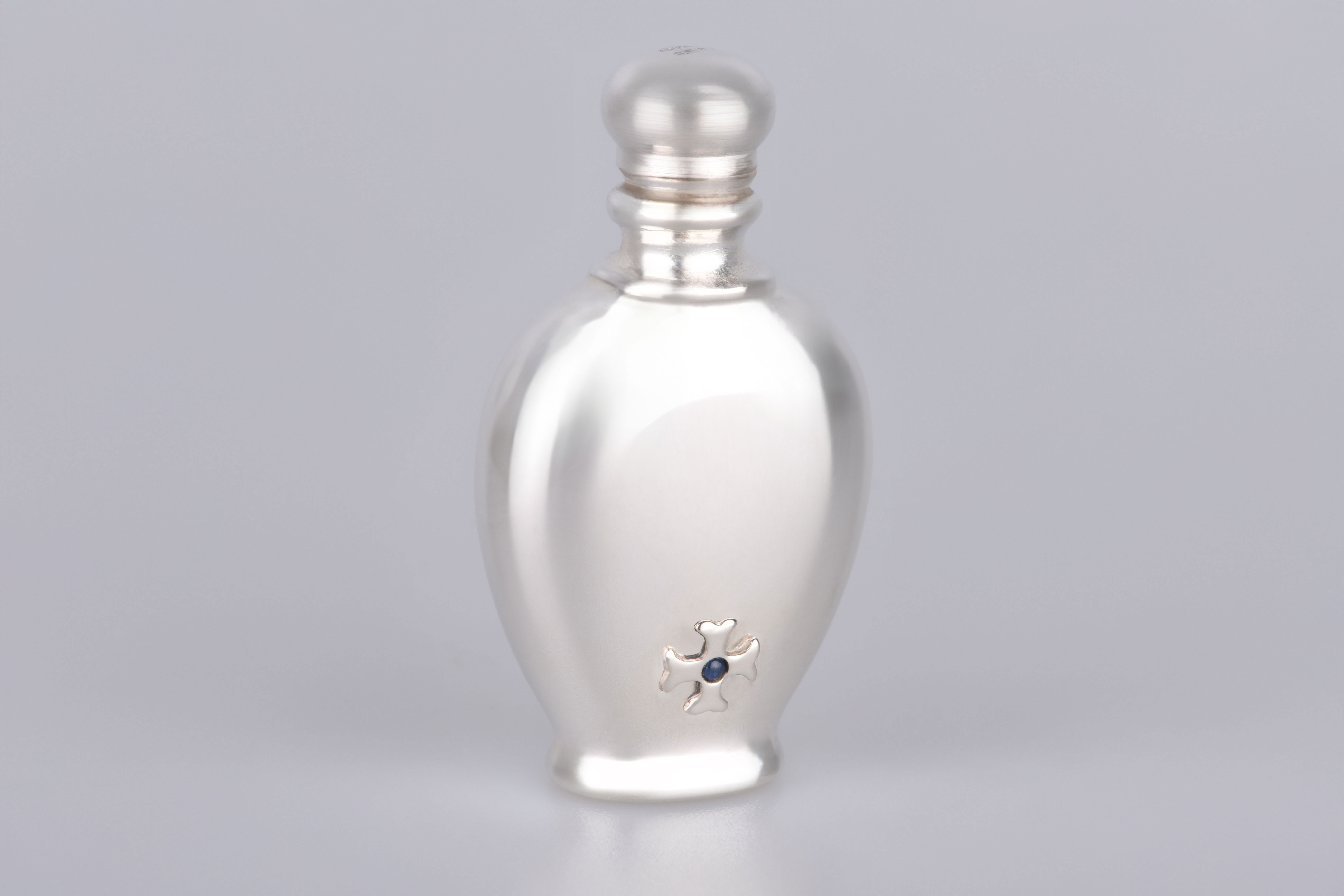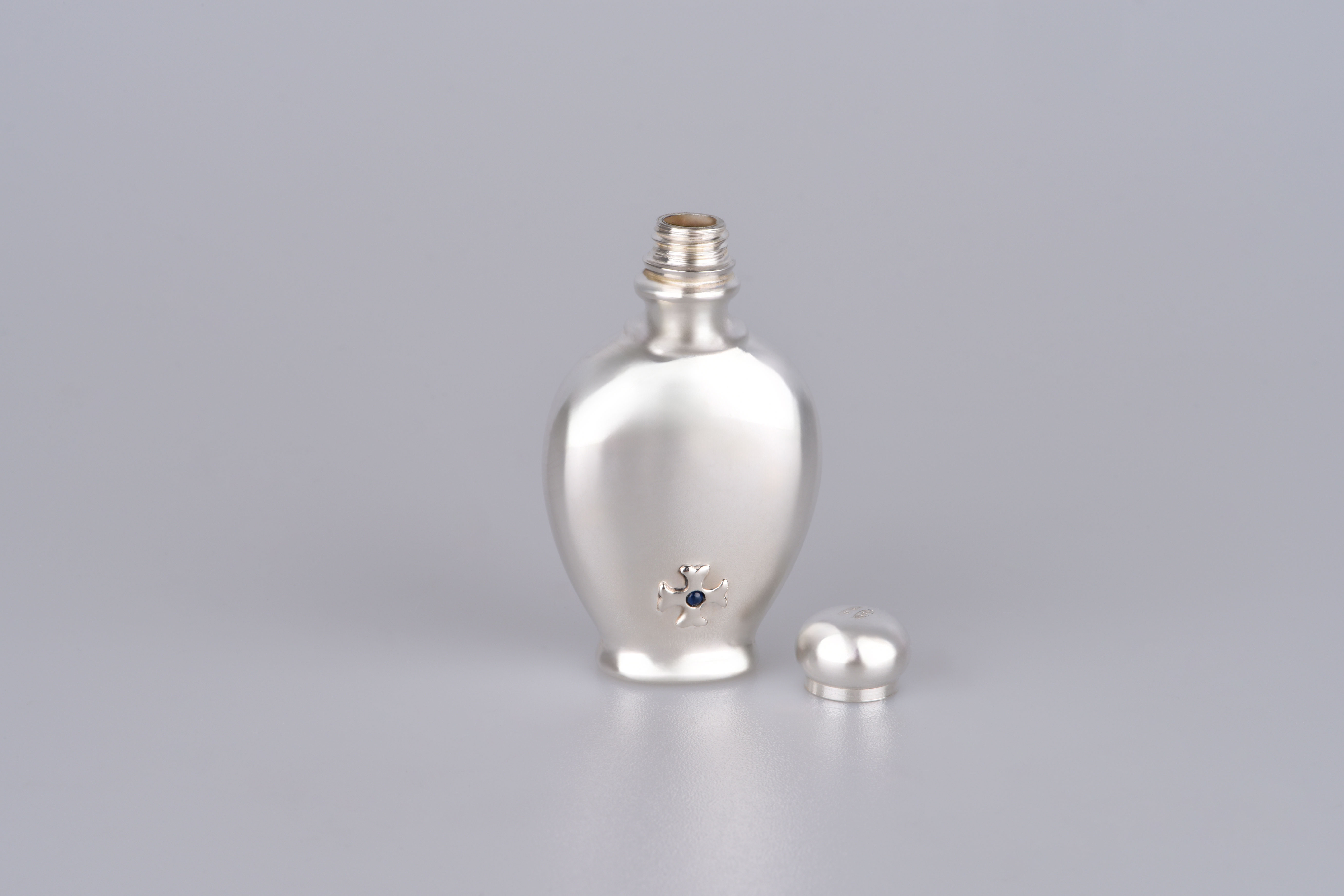 Die glänzende Oberfläche des Silbers fängt das Licht mit jeder Bewegung ein und spiegelt die Seele der Trägerin oder des Trägers wider: geheimnisvoll, elegant, mit einer Aura von Anmut. Öffnen Sie den Flacon, und der Duft, den Sie hineinfüllten, entfaltet sich wie ein Versprechen – vertraut, kostbar, einzigartig.