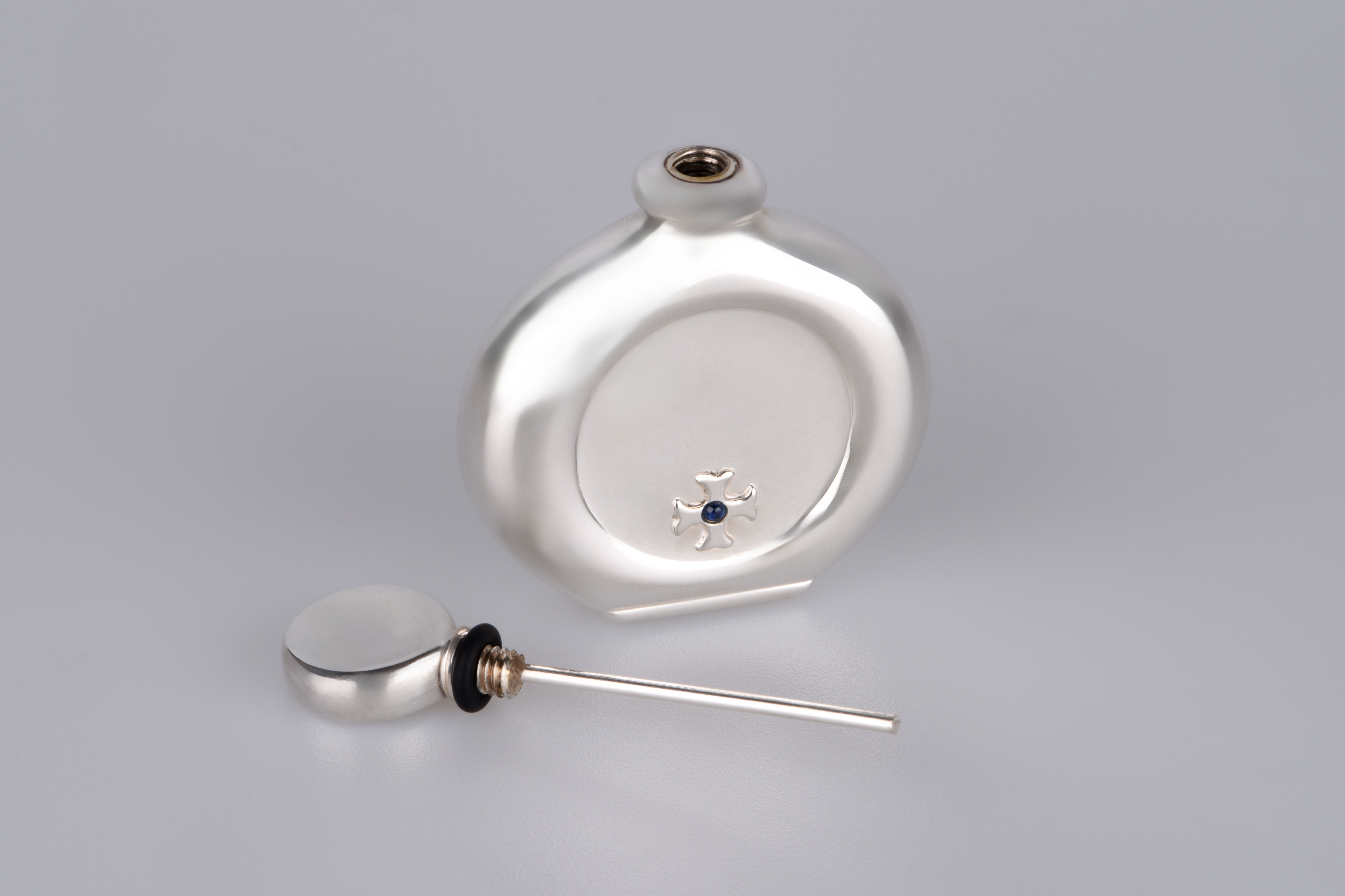 Seine Oberfläche aus Sterling Silber fängt das Licht auf magische Weise ein, reflektiert Erinnerungen, Gedanken und Emotionen – und bewahrt doch das Geheimnis des Duftes, den er in sich trägt.
