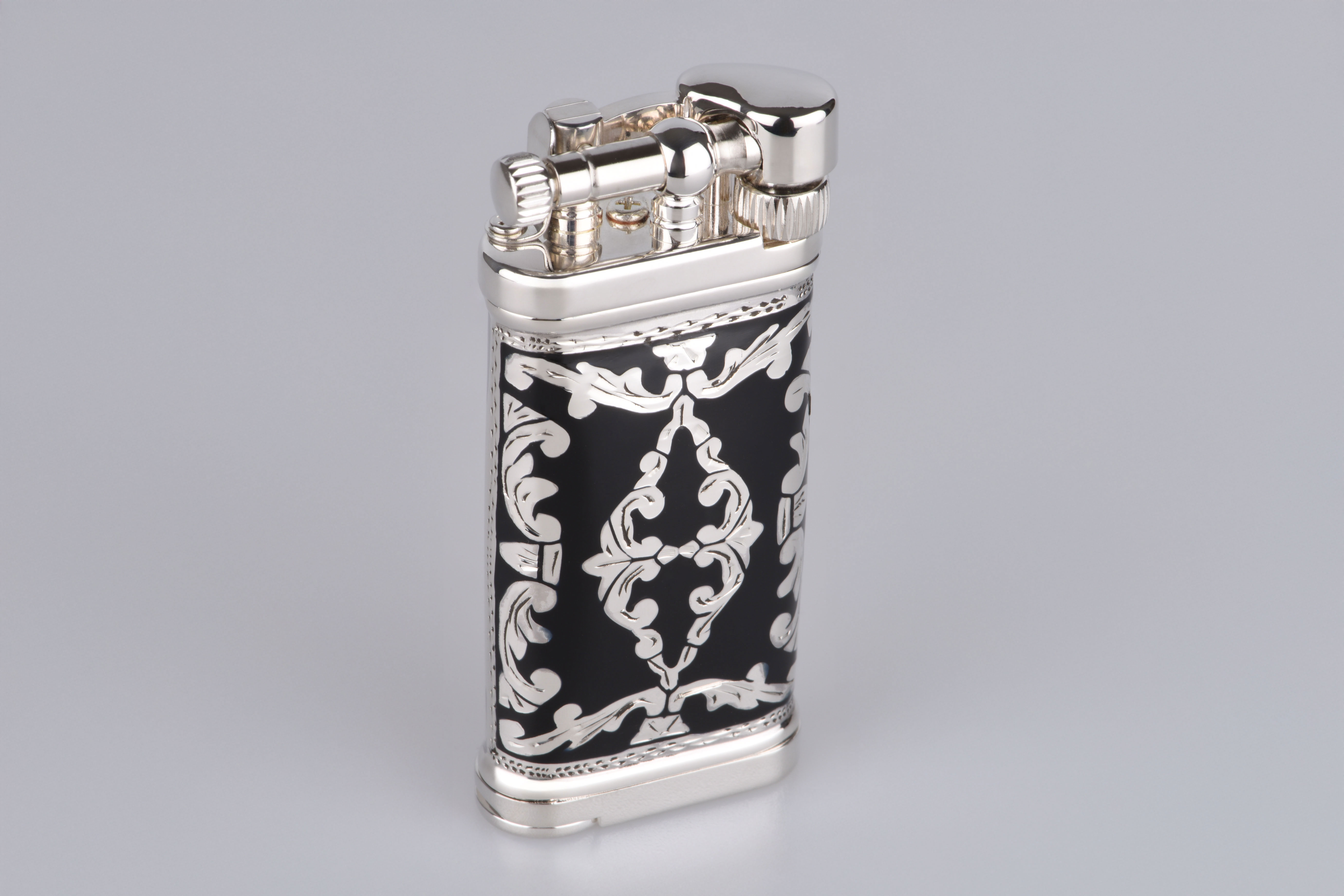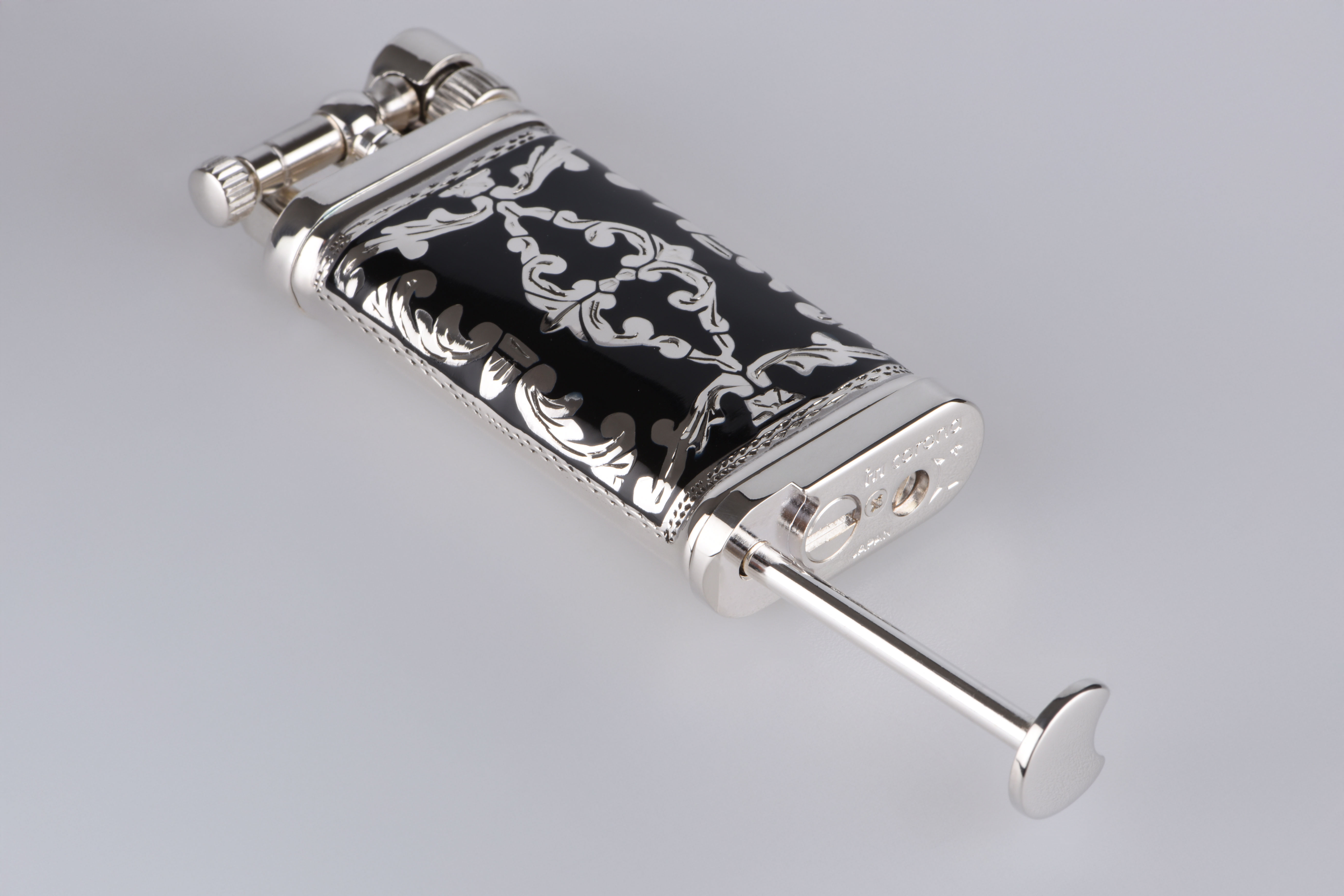 Das edle Sterling Silber verleiht dem Feuerzeug nicht nur eine elegante Ausstrahlung, sondern erzählt auch von einer jahrhundertelangen Tradition feinster Silberschmiedekunst. Die schwarze Emaille bildet dazu einen faszinierenden Kontrast, der das Design modern, zugleich aber auch klassisch wirken lässt. Jedes Detail wurde mit höchster Präzision und Liebe zum Detail gestaltet – ein echtes Sammlerstück, das Generationen überdauern wird.