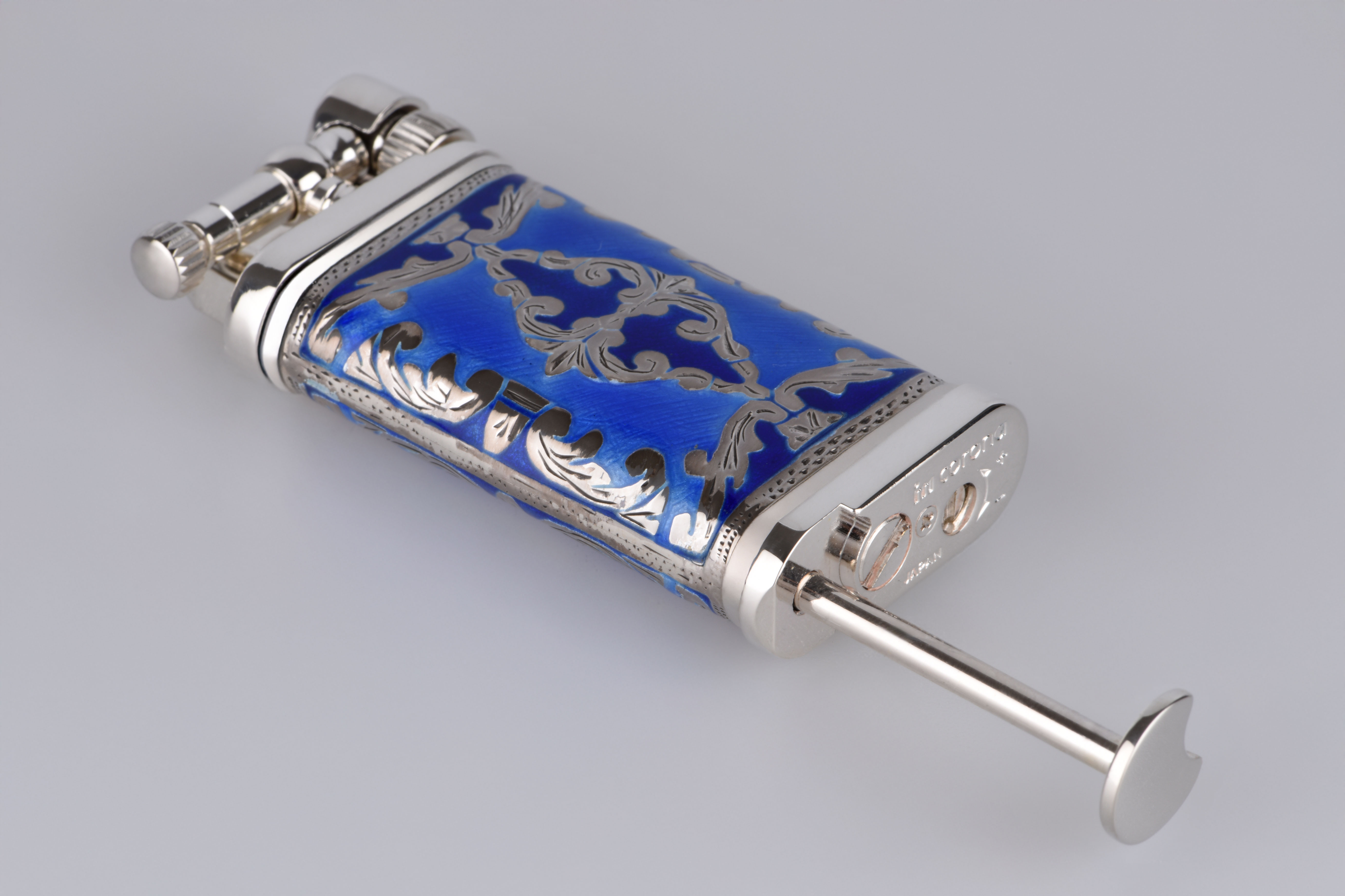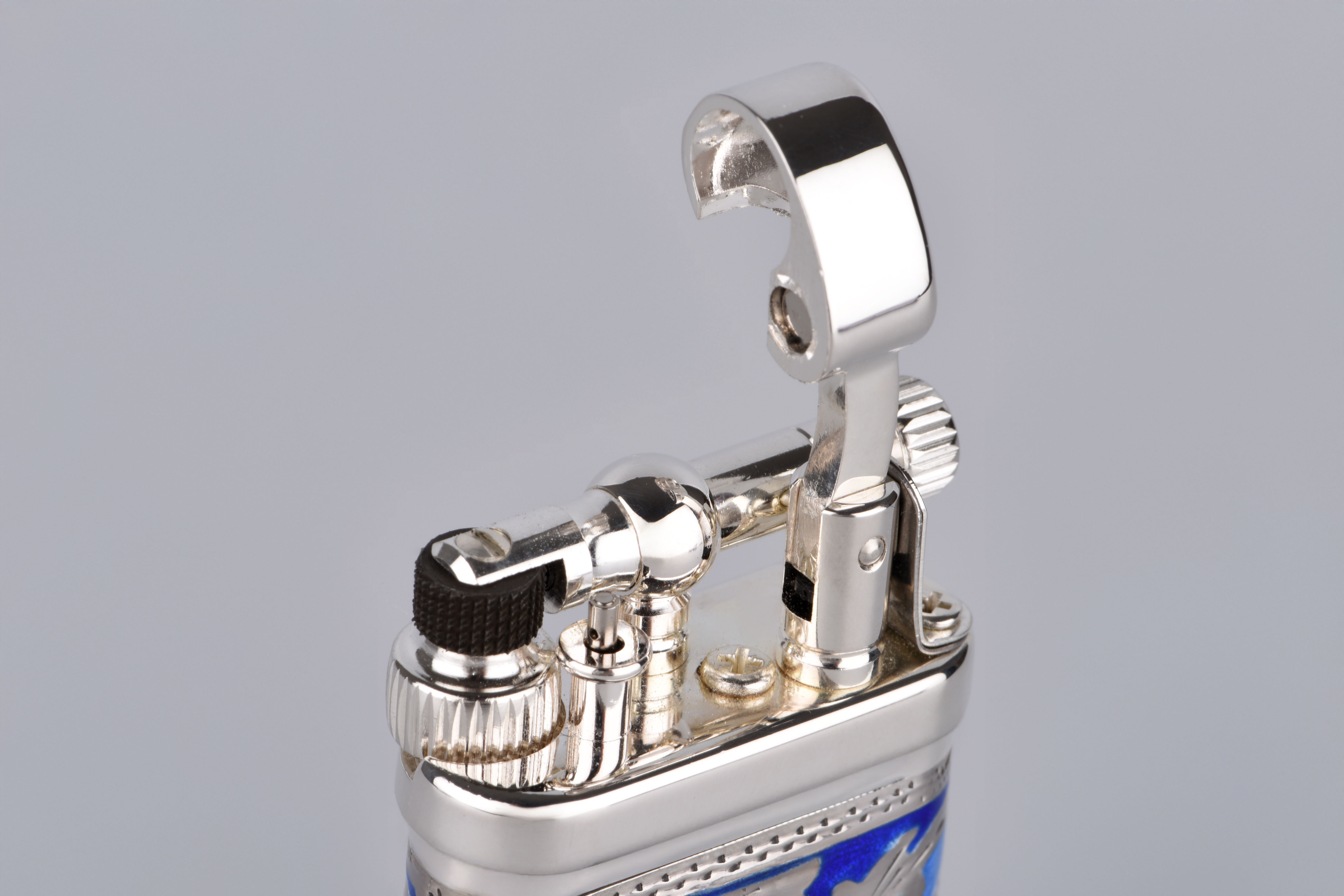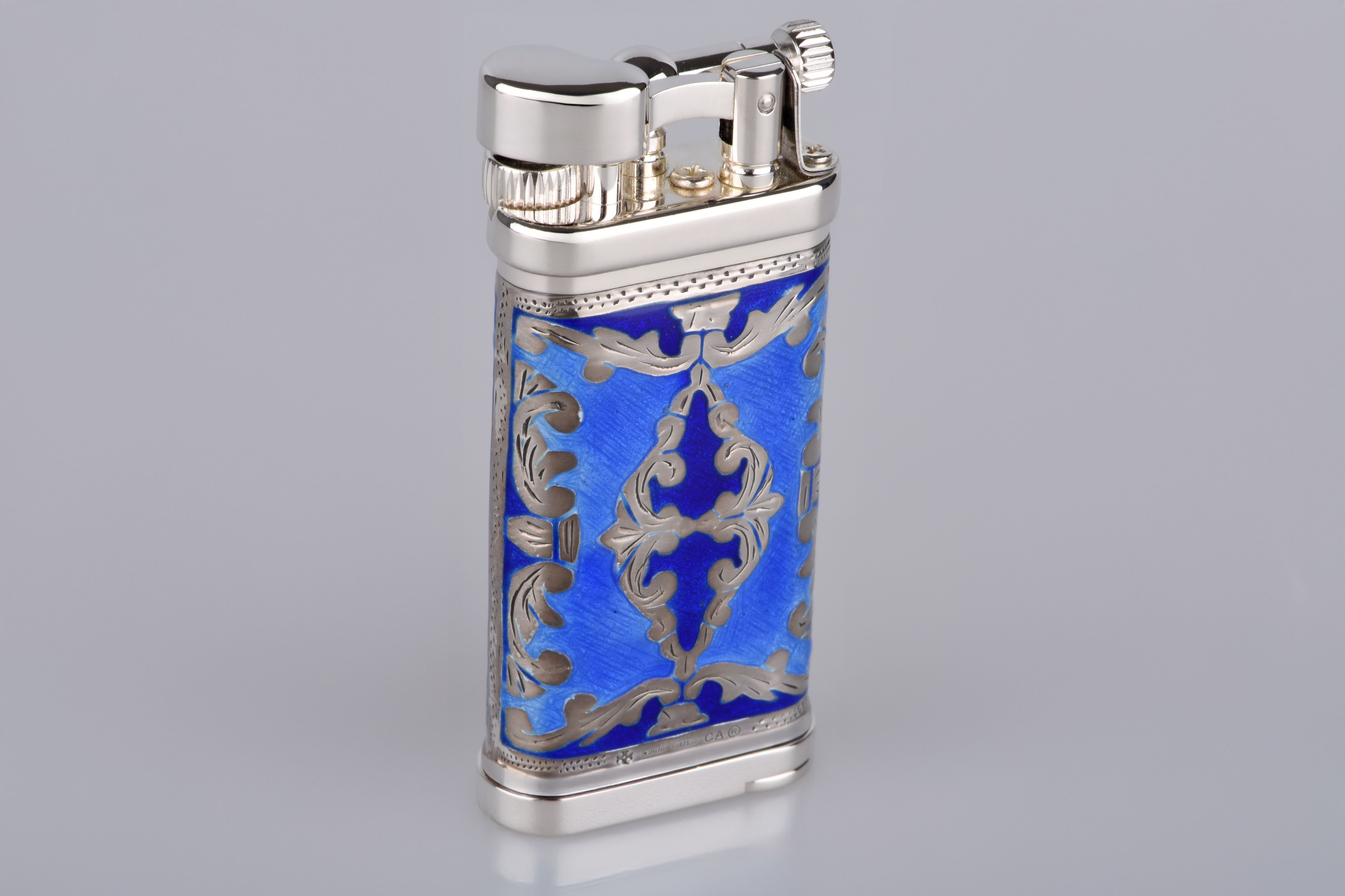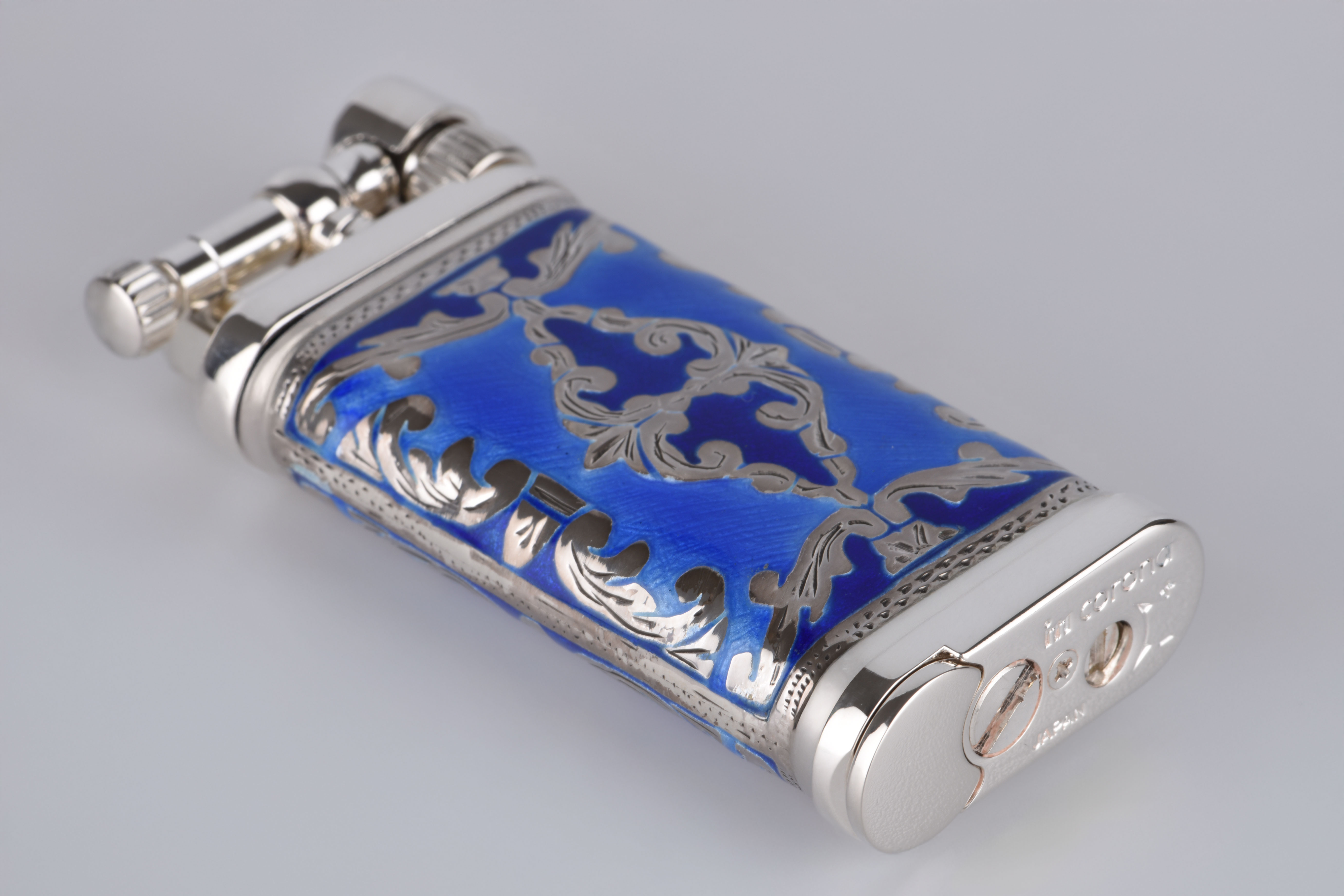 Das Design trägt nicht ohne Grund den Namen „2 Face“. Zwei kunstvoll gestaltete Seiten spiegeln die Vielschichtigkeit seines Besitzers wider: die eine ruhig, elegant und tiefgründig – die andere markant, fast rebellisch. Die brillante blaue Emaille schimmert je nach Lichteinfall in verschiedenen Nuancen, wie die Oberfläche eines ruhigen Sees, hinter dem sich ein Ozean an Geschichten verbirgt. Sie kontrastiert dabei harmonisch mit der kühlen Klarheit des echten Sterling Silbers, das diesem Feuerzeug eine Aura von Unvergänglichkeit verleiht.