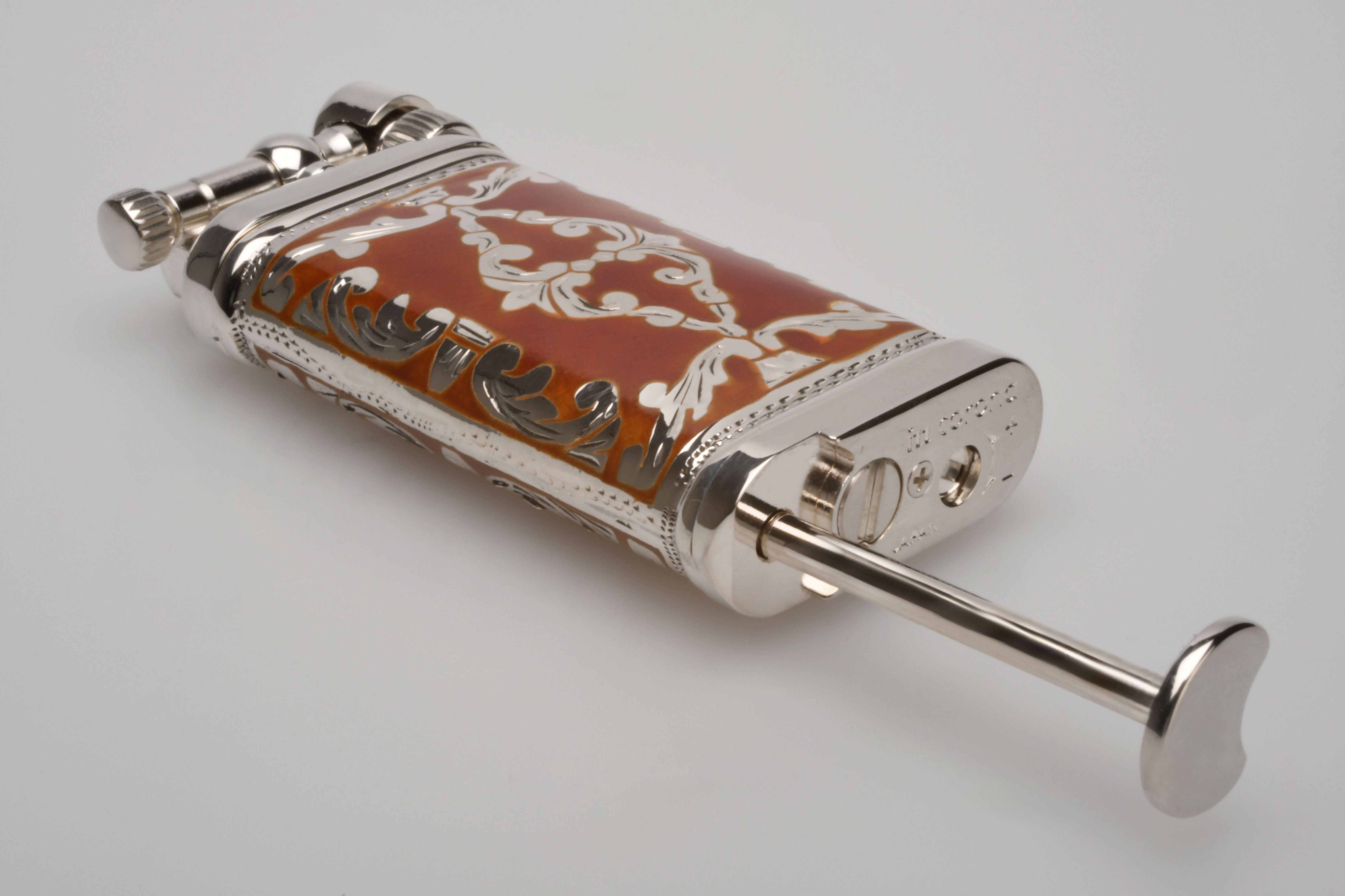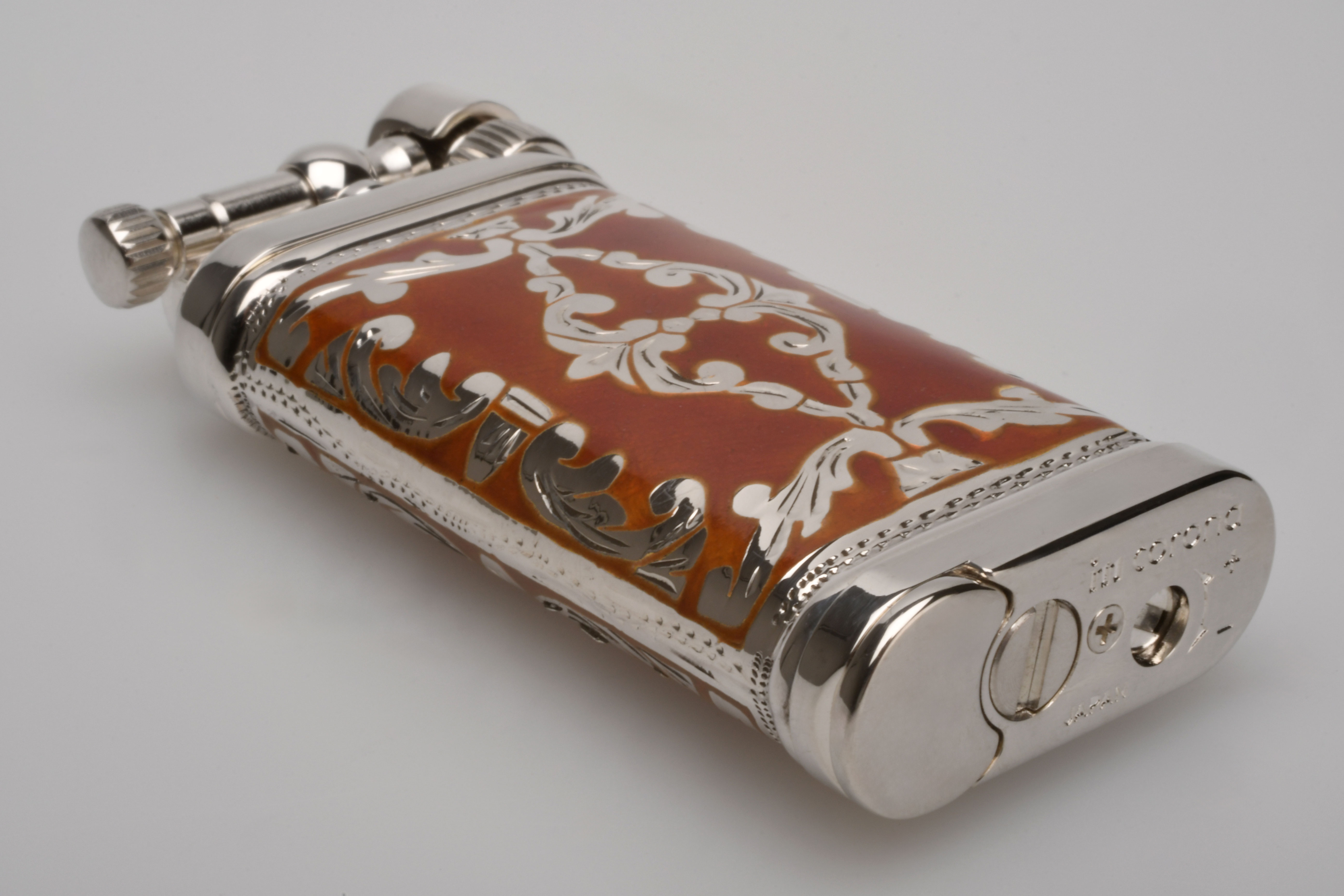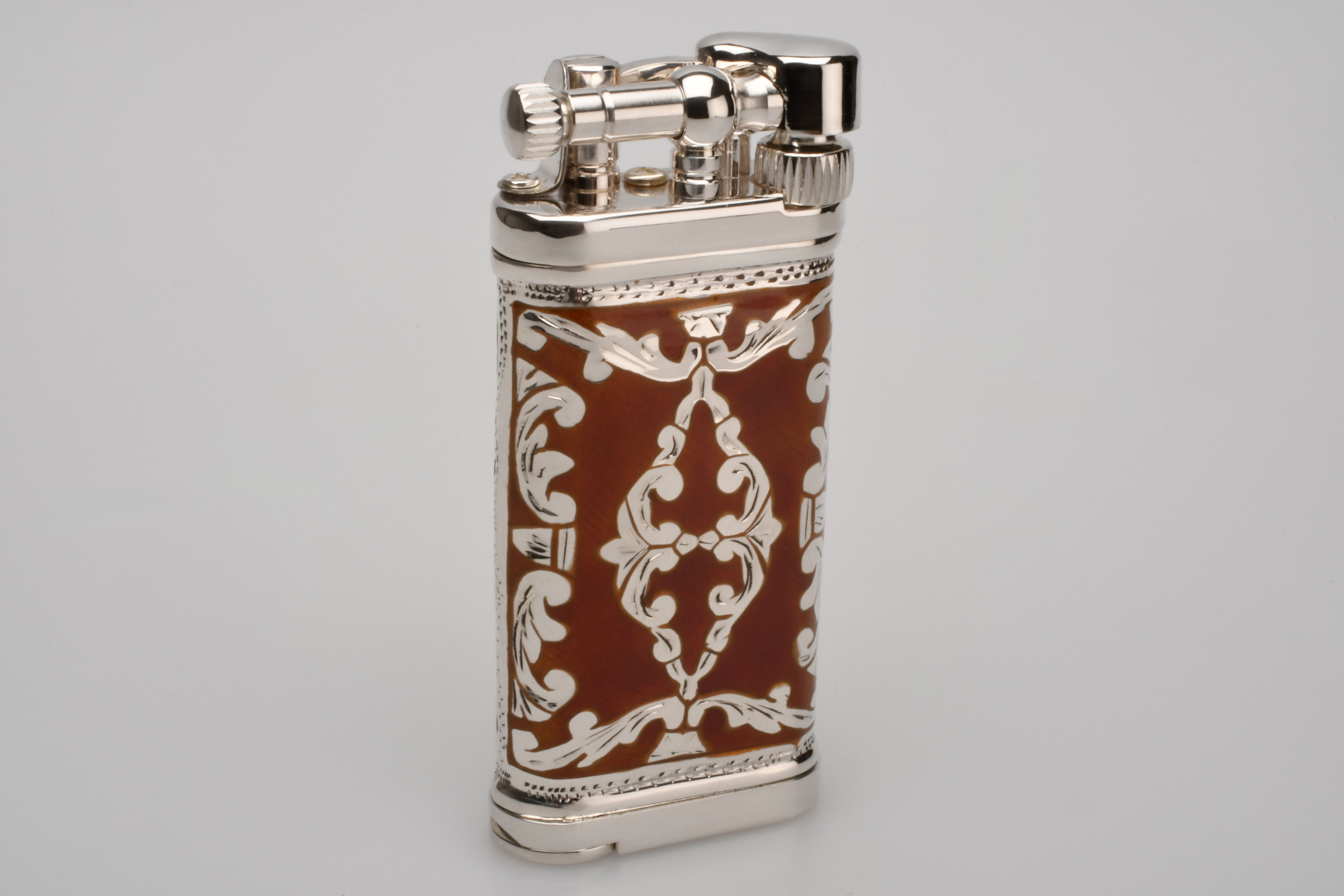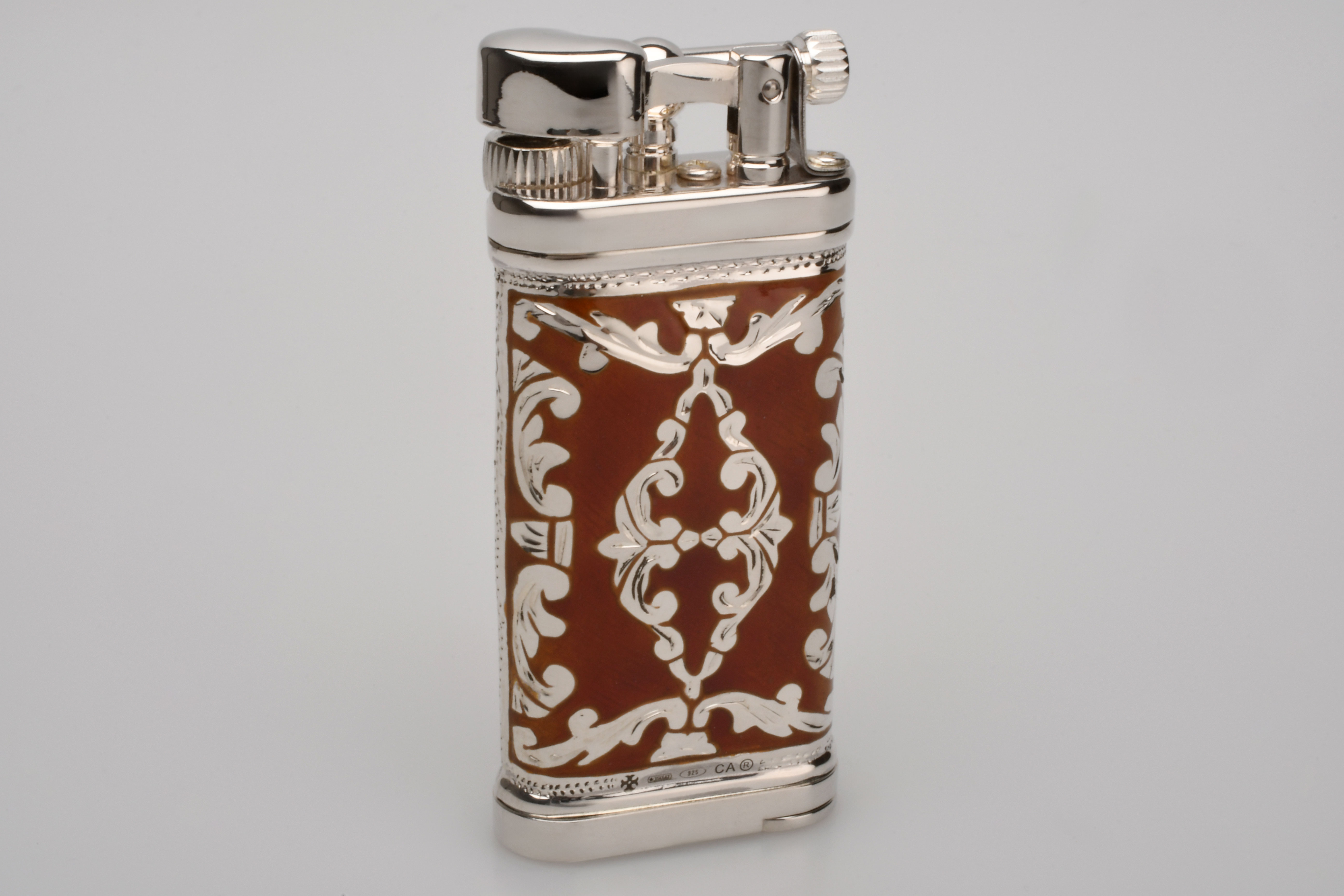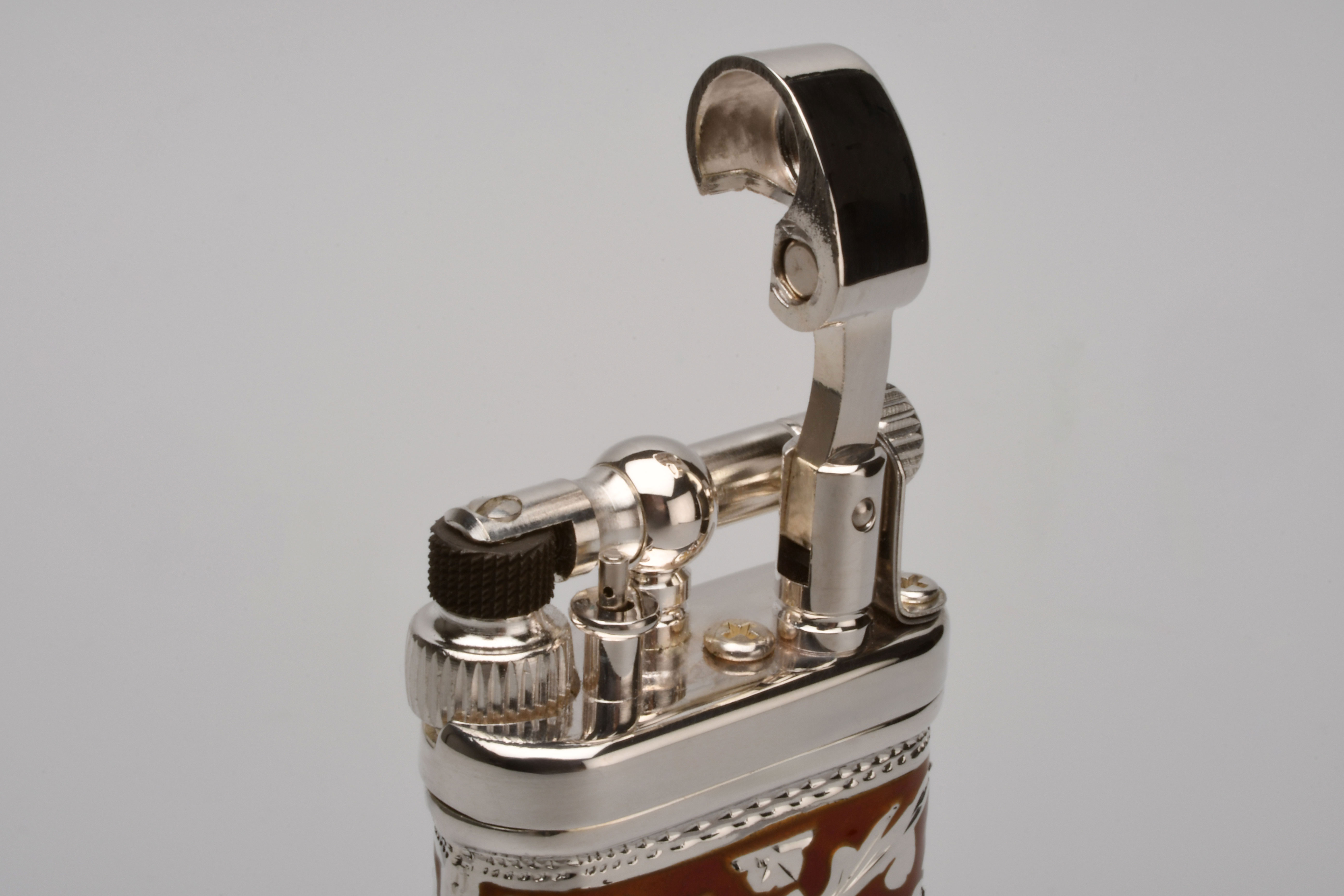 Im Herzen des Feuerzeugs arbeitet eine Corona-Mechanik, die stark versilbert ist und für eine sanfte, aber kraftvolle Entzündung sorgt – ein Detail, das die technische Präzision und Langlebigkeit dieses Meisterstücks unterstreicht.