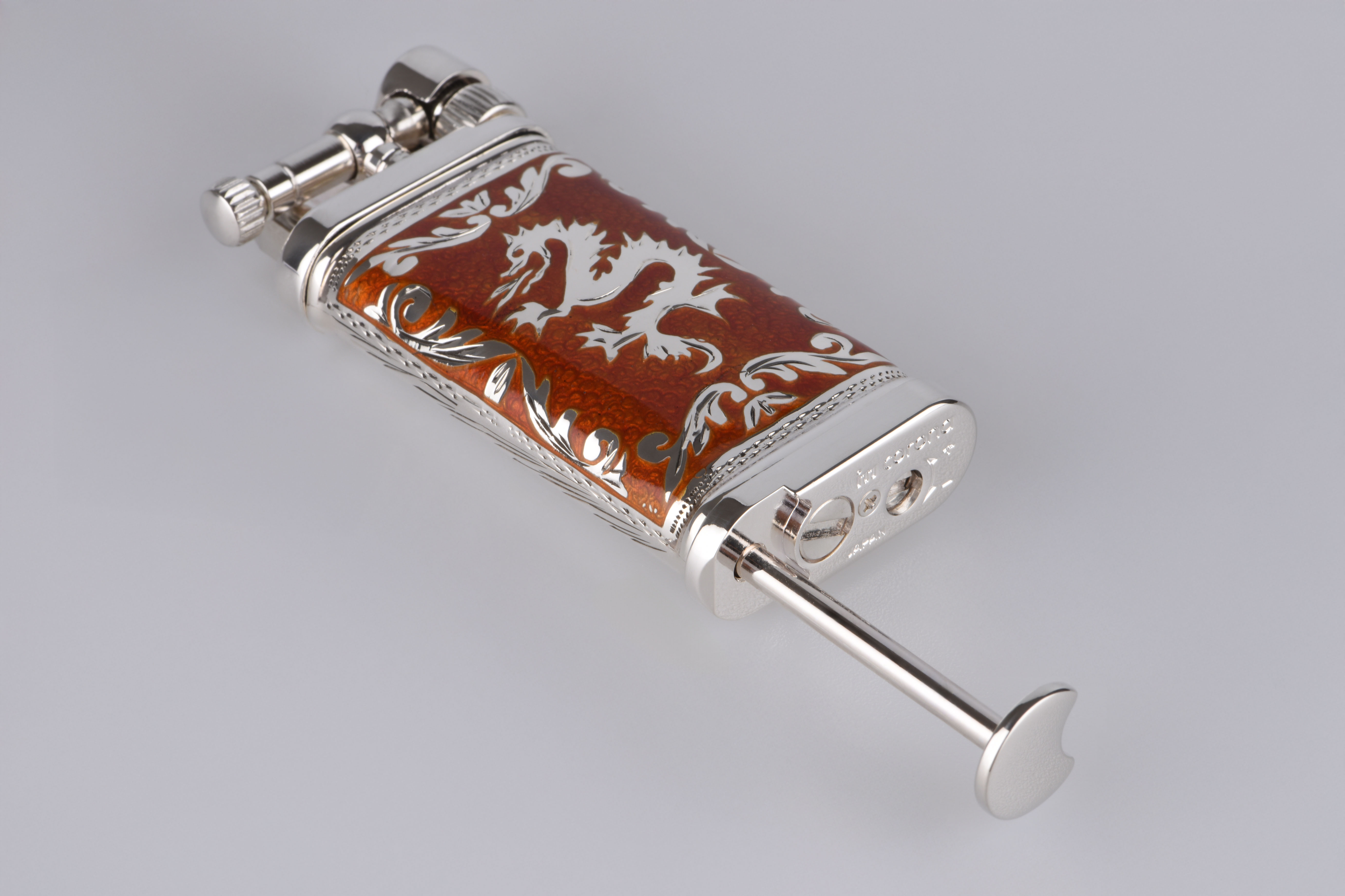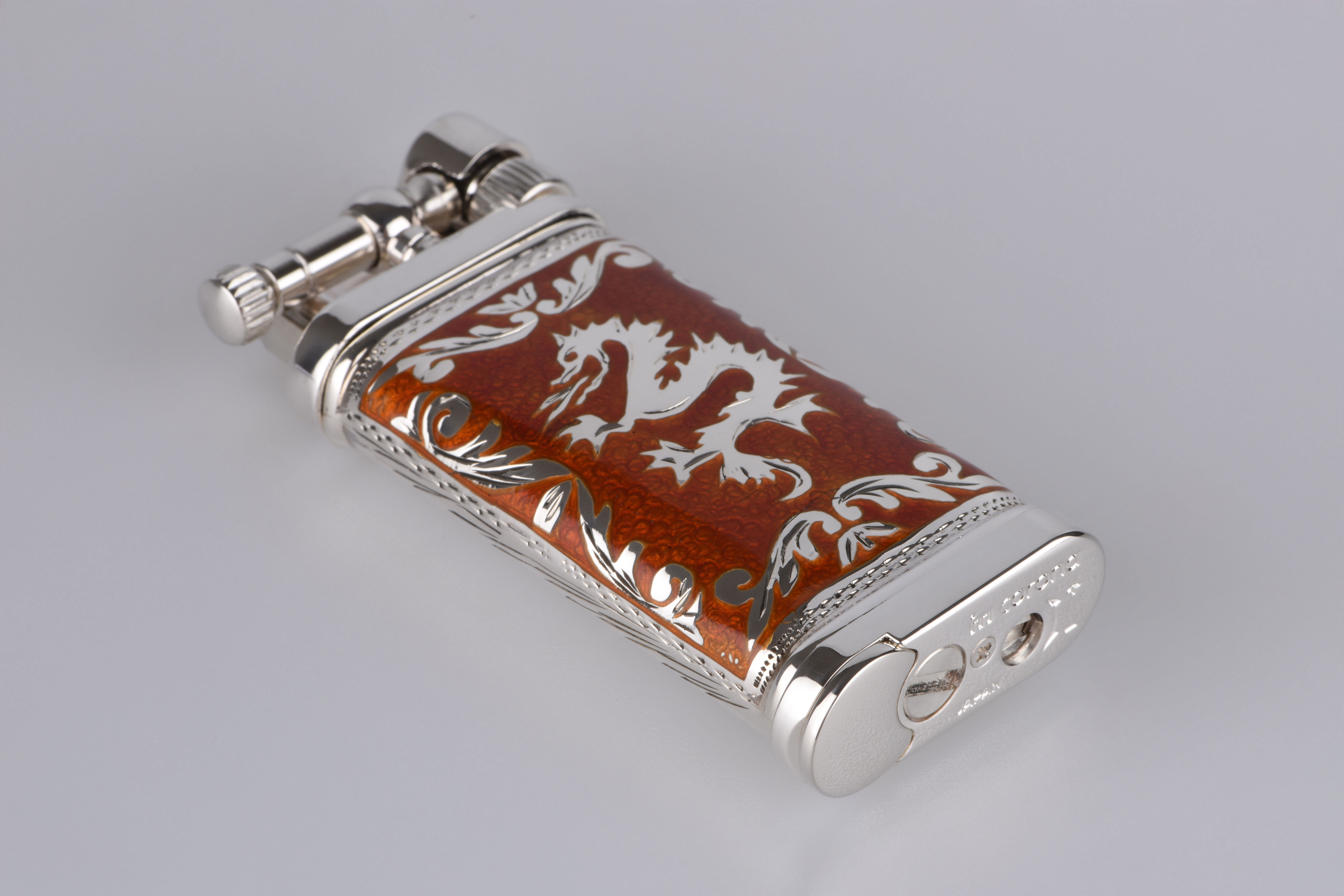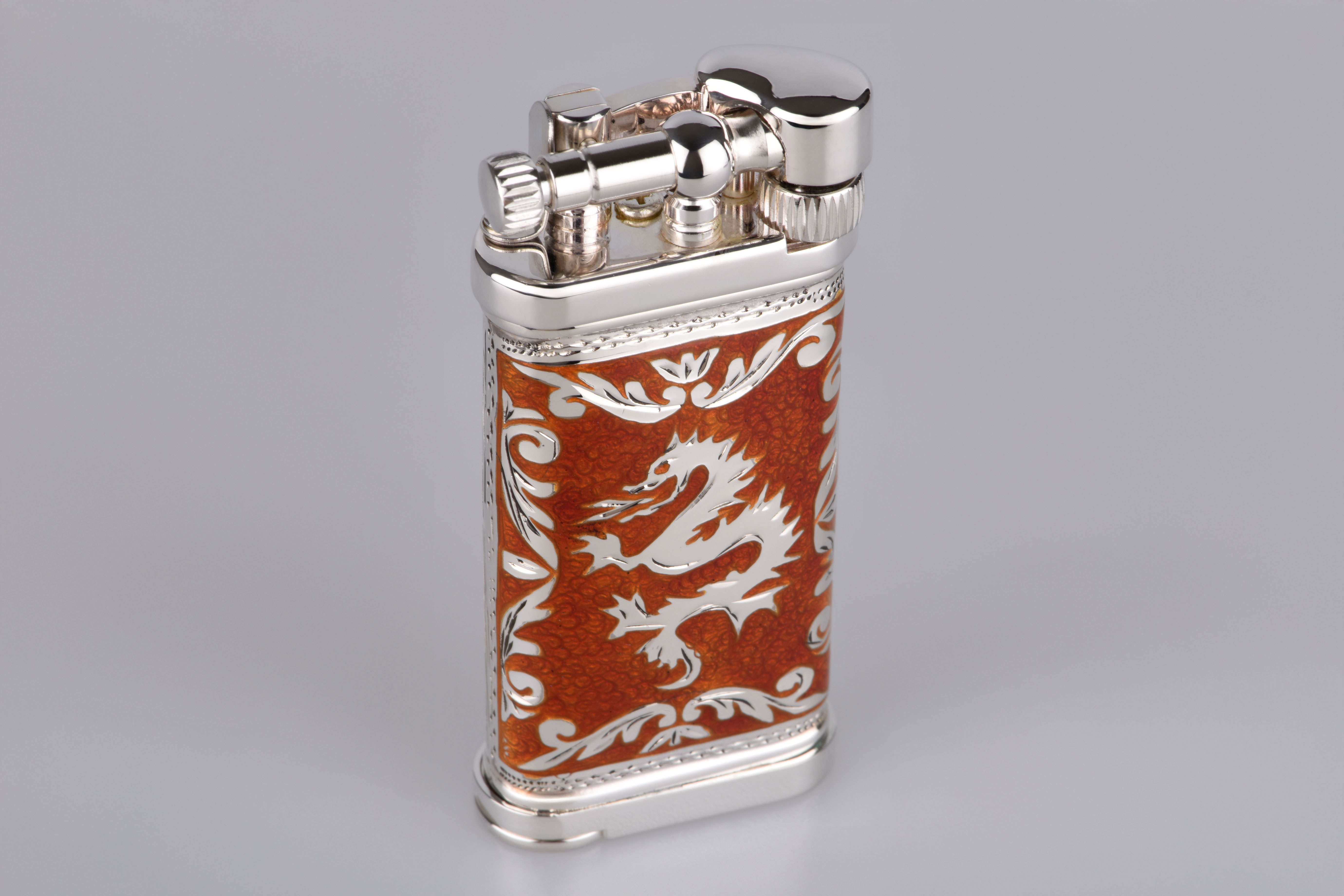 Jedes Detail dieses einzigartigen Feuerzeugs wurde mit größter Sorgfalt gestaltet. Die Kombination aus hochwertigem 925er Sterling Silber und leuchtend roter Emaille zieht alle Blicke auf sich und erzählt eine Geschichte von Mut und Kraft – verkörpert im kunstvoll gearbeiteten Drachen-Motiv. Dieses Motiv steht für Weisheit und Stärke, für die unerschütterliche Energie, die Sie bei jedem Gebrauch spüren werden.