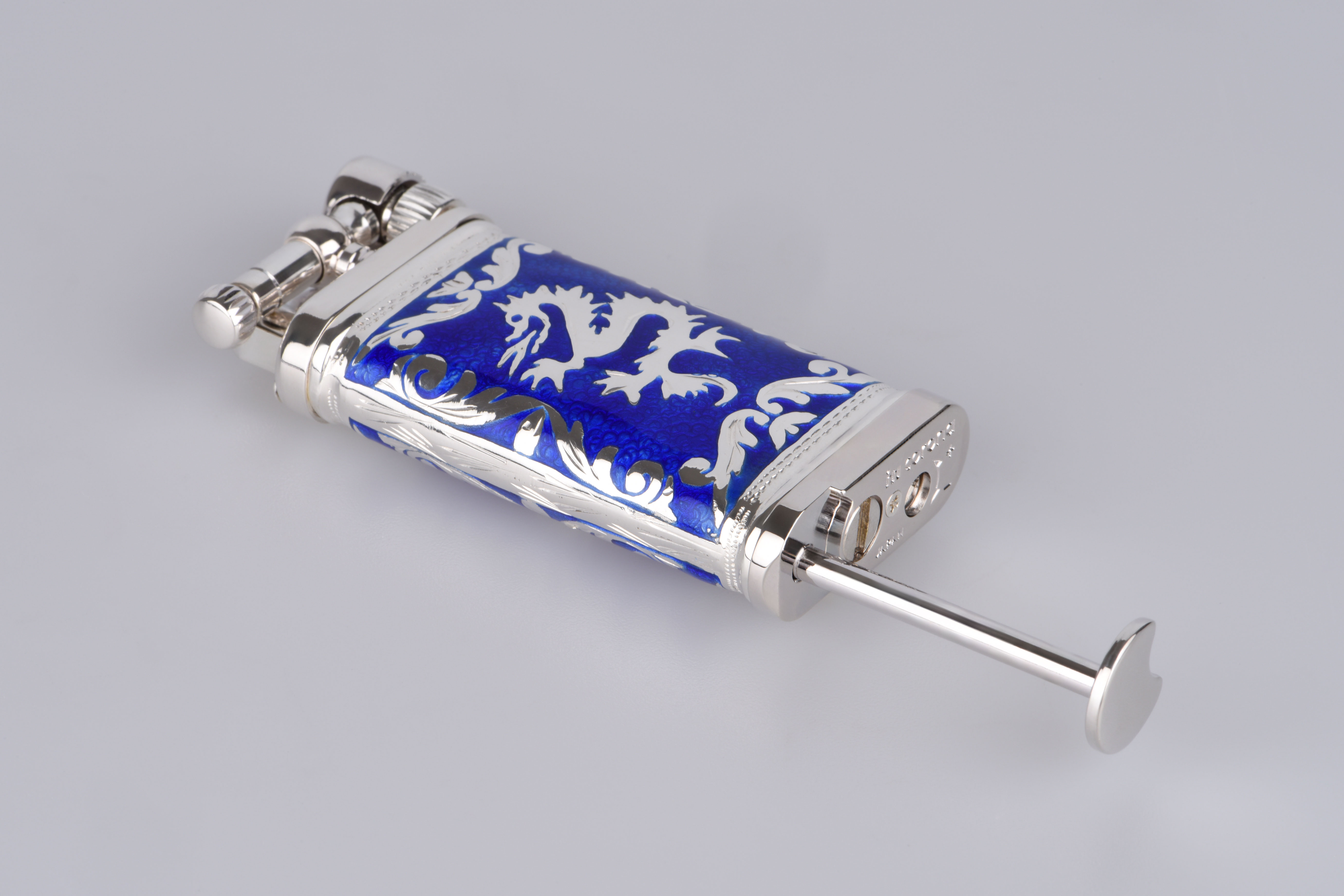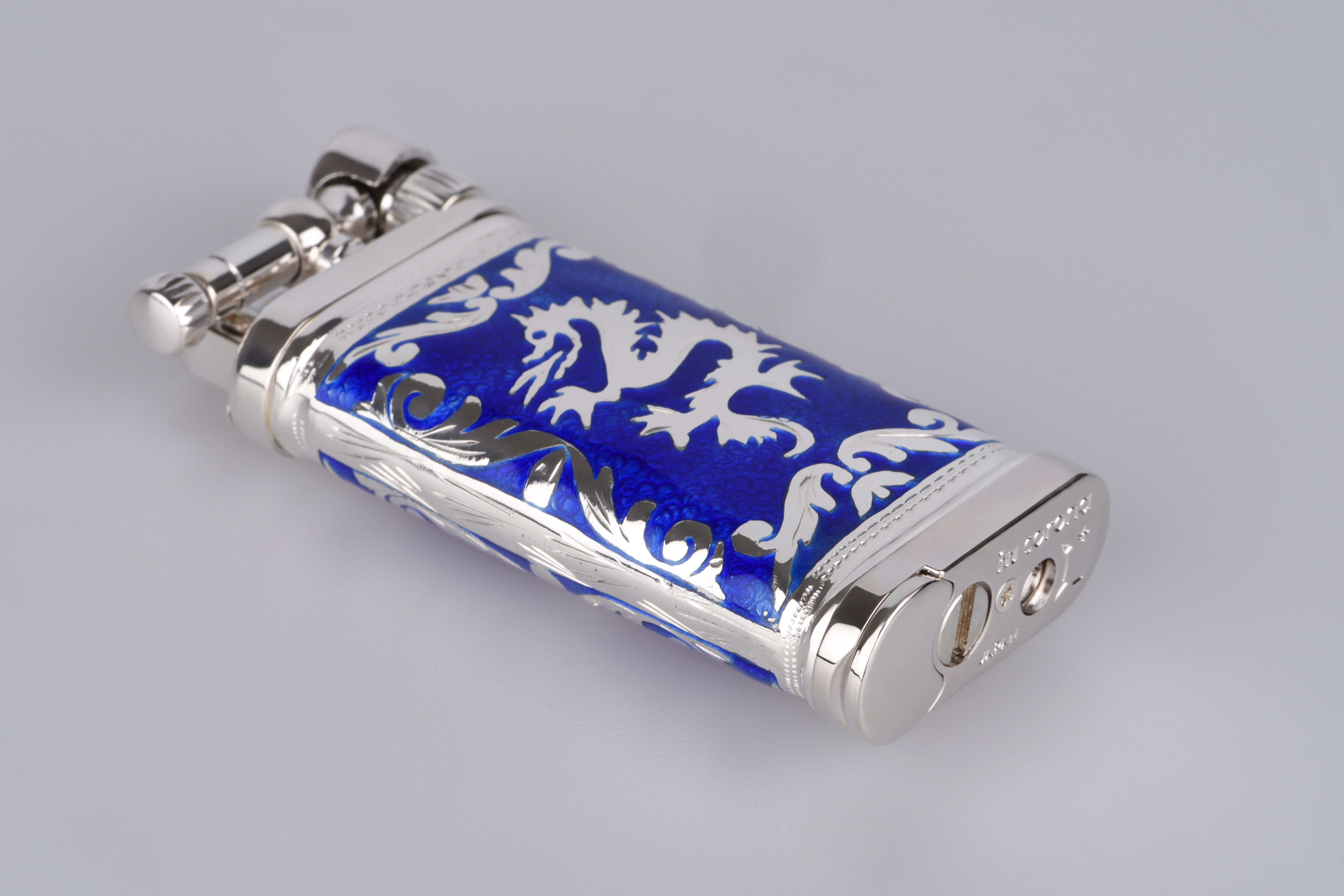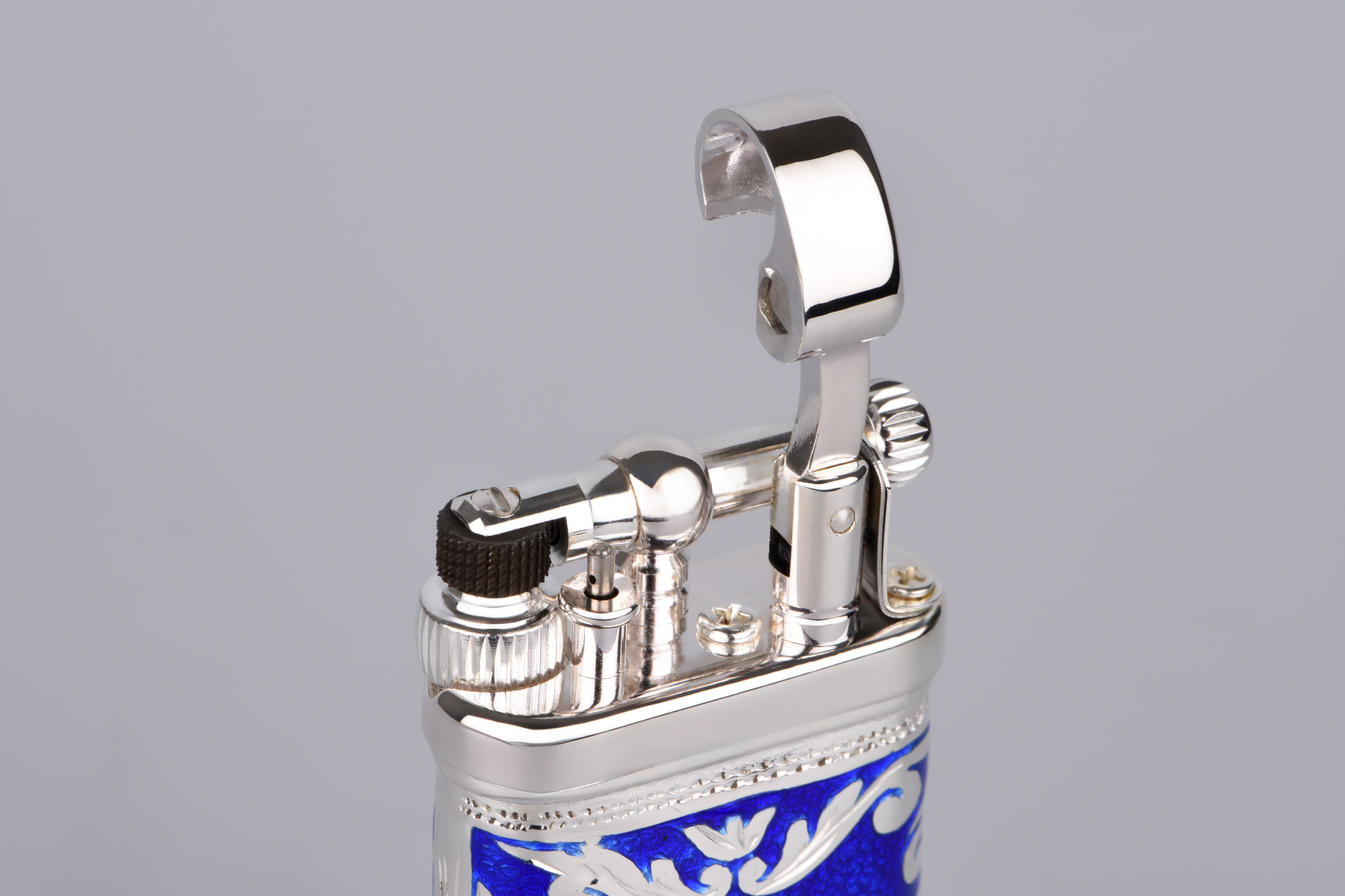 Mit einer Größe von 6,5 x 3 cm liegt es spürbar wertig in der Hand. Das Gewicht von 89 Gramm verstärkt dieses Gefühl von Substanz und Präzision – nichts ist hier zufällig, alles ist auf Langlebigkeit und Schönheit ausgelegt. Die Oberfläche aus Emaille in leuchtendem Blau bildet einen faszinierenden Kontrast zum edlen Silber – ein Feuerzeug wie ein Kunstwerk, geschaffen für jene, die das Besondere suchen.