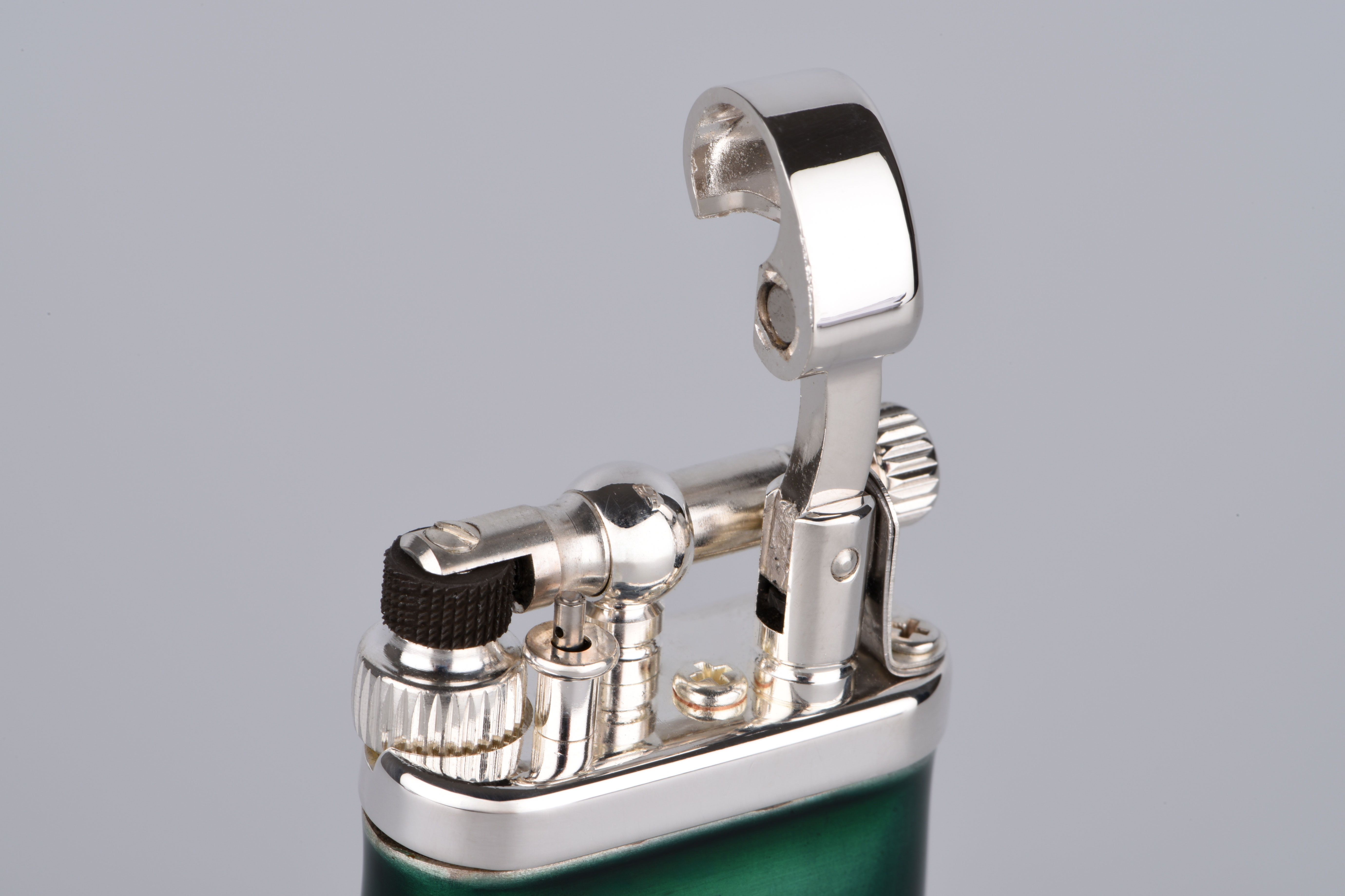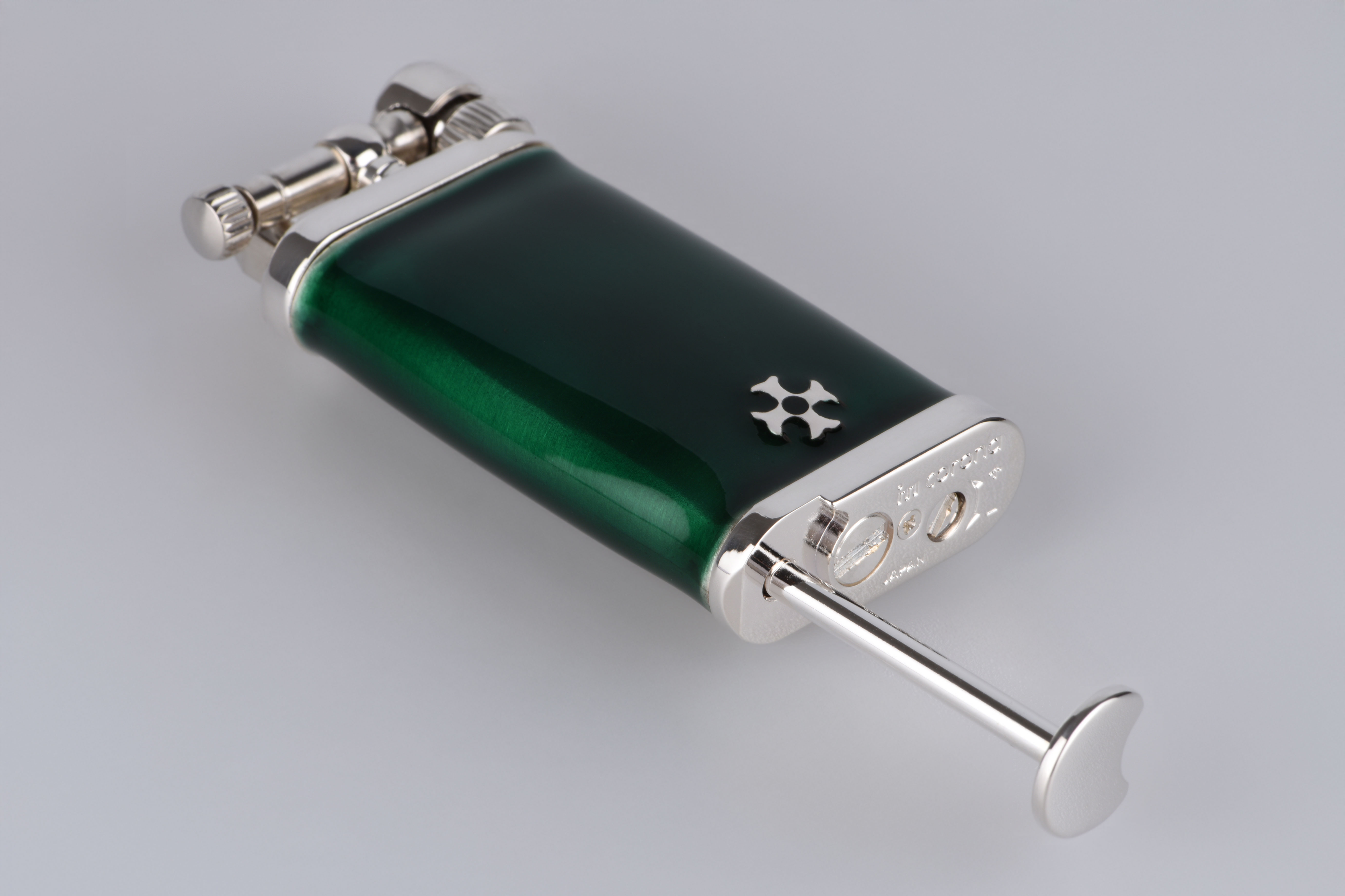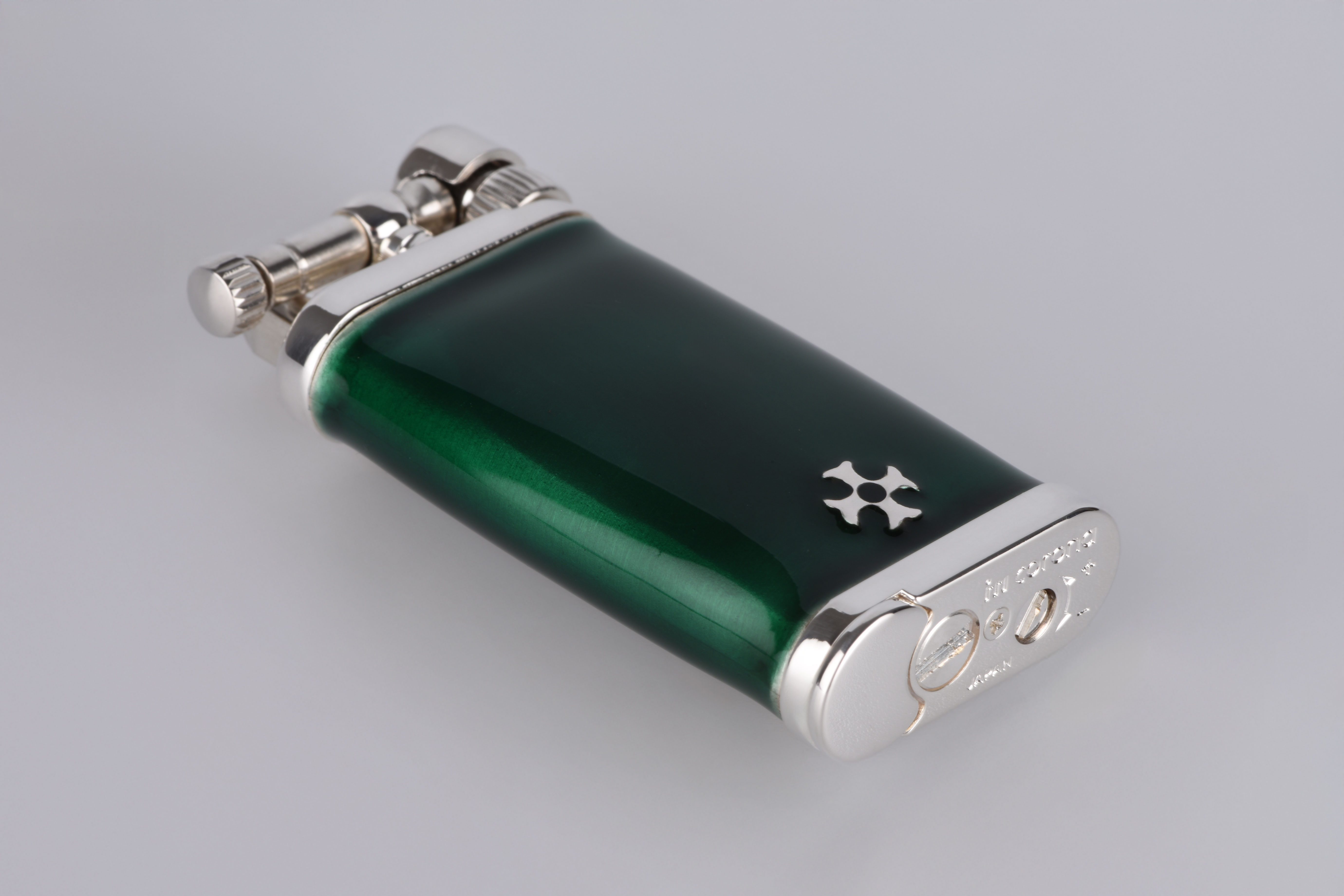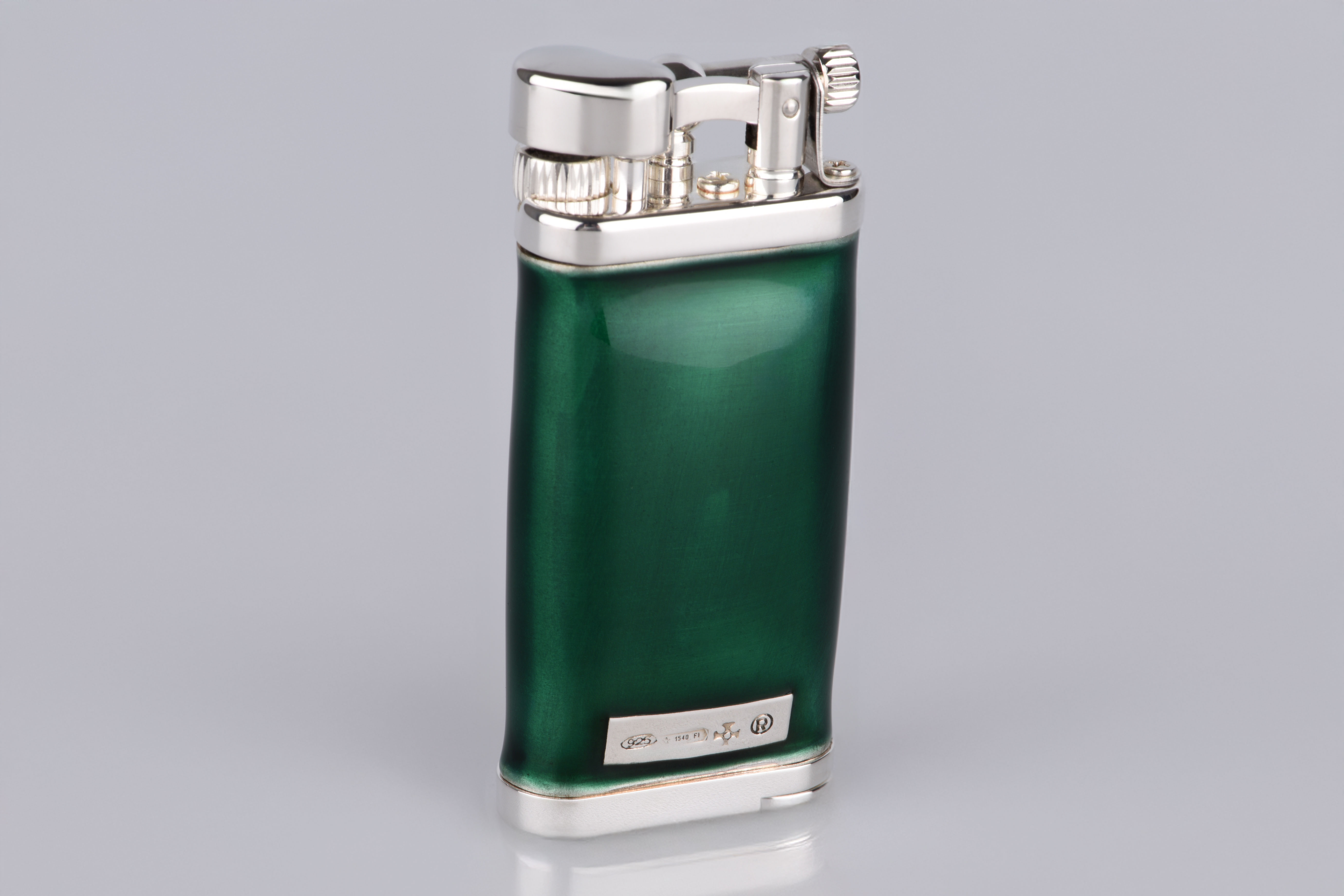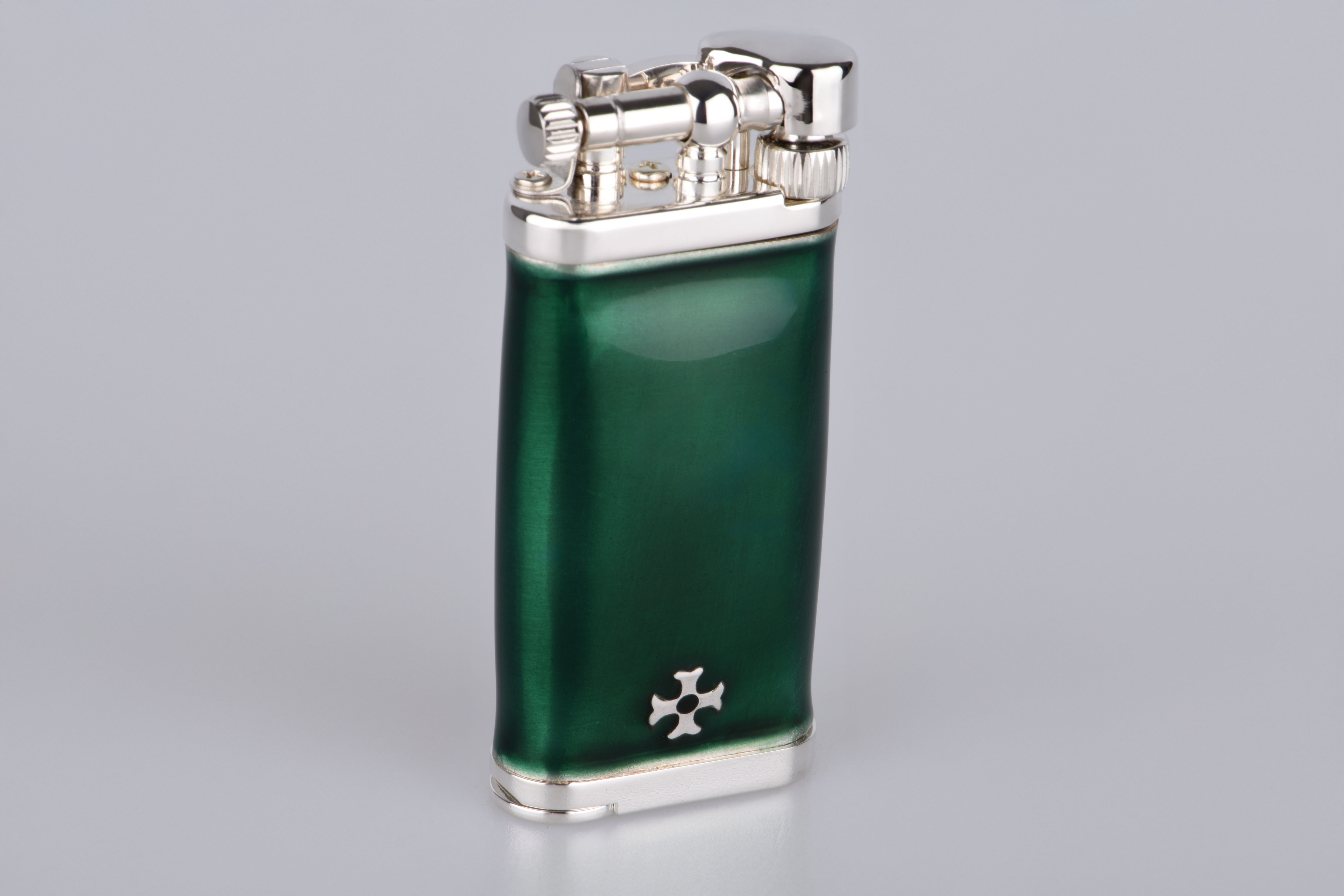 Gefertigt aus edlem 925er Sterling Silber und veredelt mit tiefgrüner Kaltemaille, vereint dieses Feuerzeug Tradition mit luxuriöser Zurückhaltung. Die fein gearbeitete Oberfläche reflektiert das Licht auf sanfte Weise – fast so, als wolle sie die Wärme eines vergangenen Jahrhunderts einfangen. Das satte Grün der Emaille ist nicht einfach nur Farbe – es ist ein Gefühl: von Ruhe, Tiefe, Charakter.