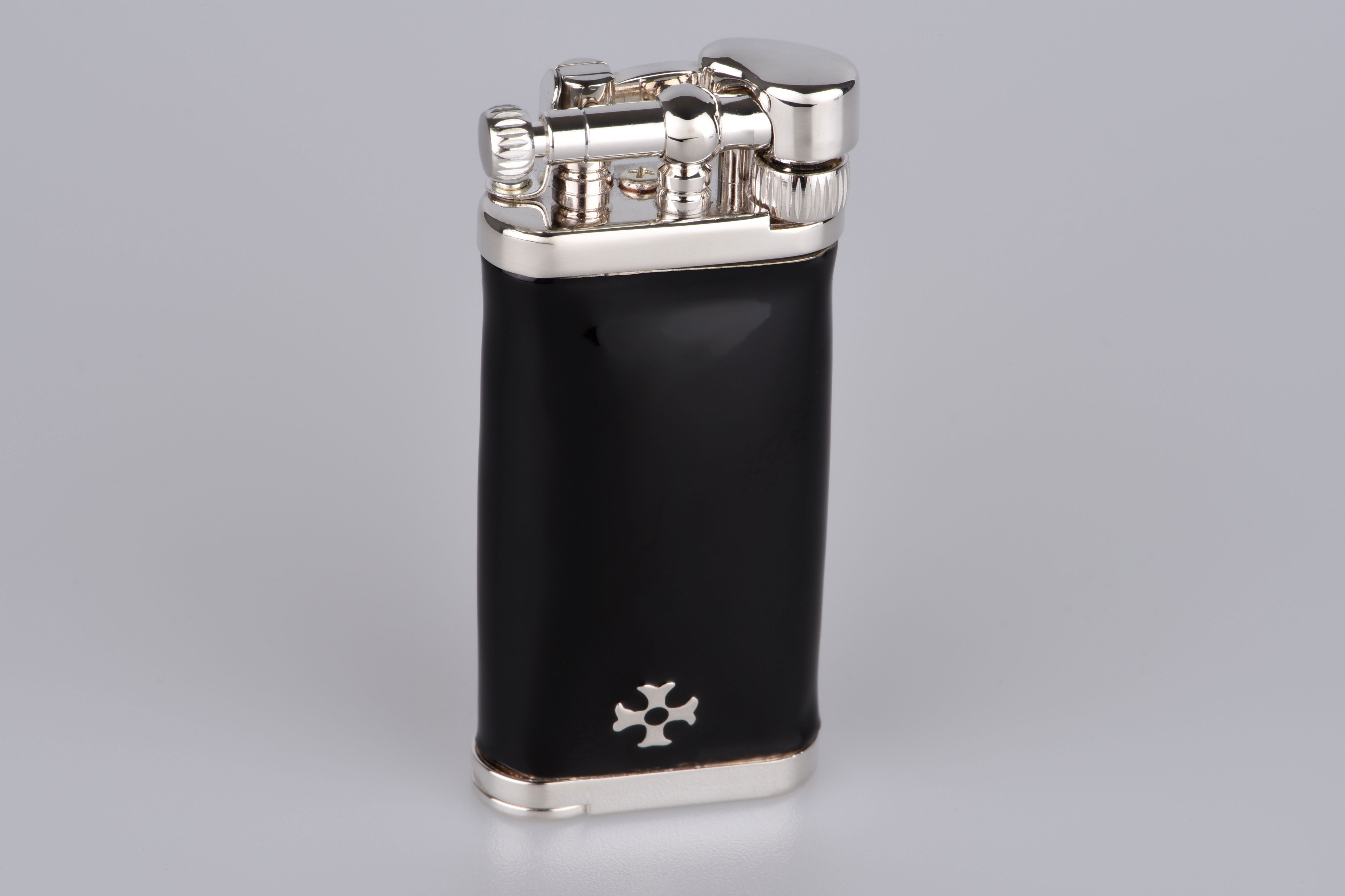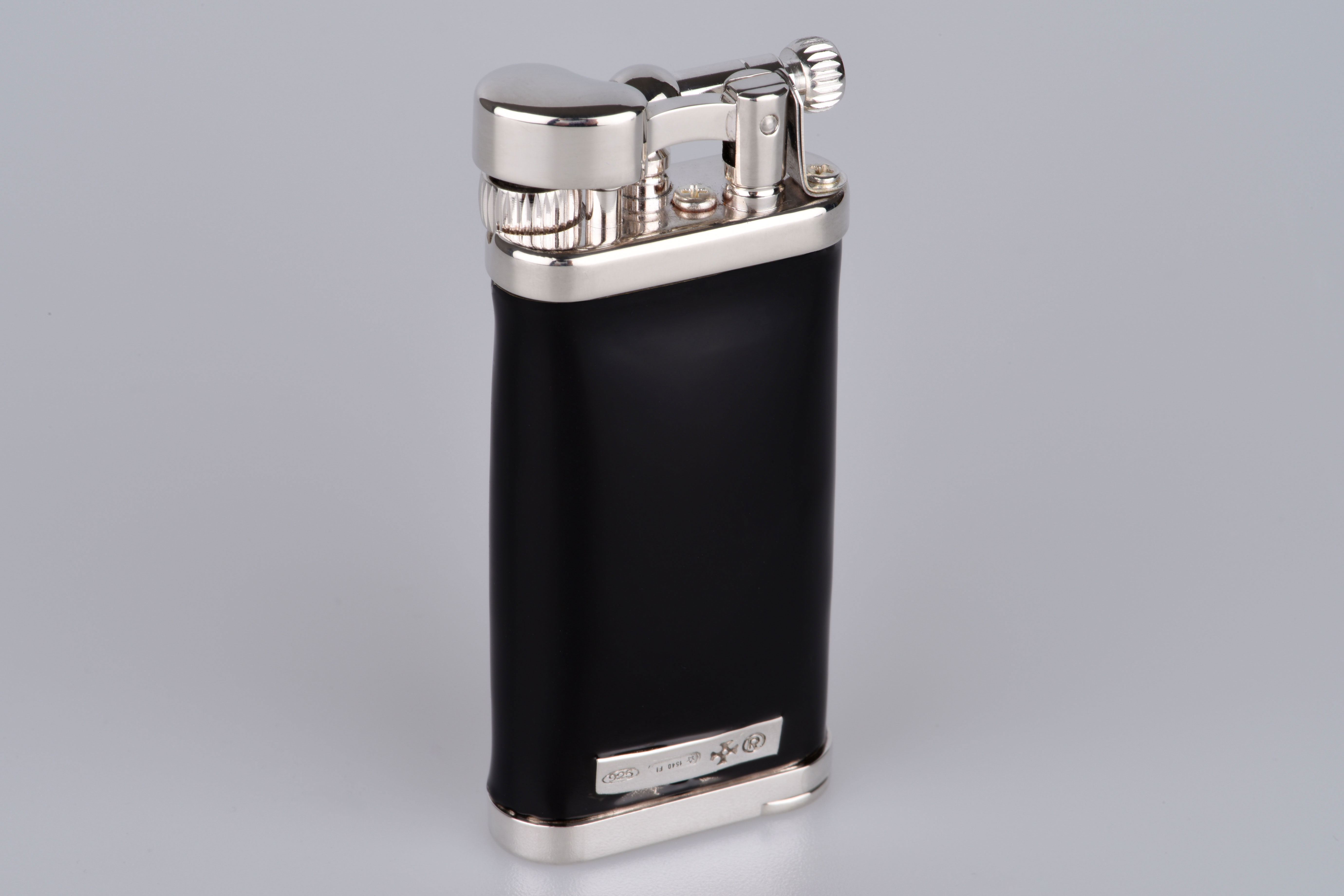 Gefertigt aus edlem 925er Sterling Silber, von Hand veredelt mit tiefschwarzer Kaltemaille, liegt dieses Feuerzeug mit seinen 85 Gramm angenehm schwer und gleichzeitig geschmeidig in der Hand. Jedes Detail – von den maßvollen 6,5 x 3 cm bis zur fein abgestimmten Mechanik – zeugt von handwerklicher Präzision und dem Gespür für das Besondere.