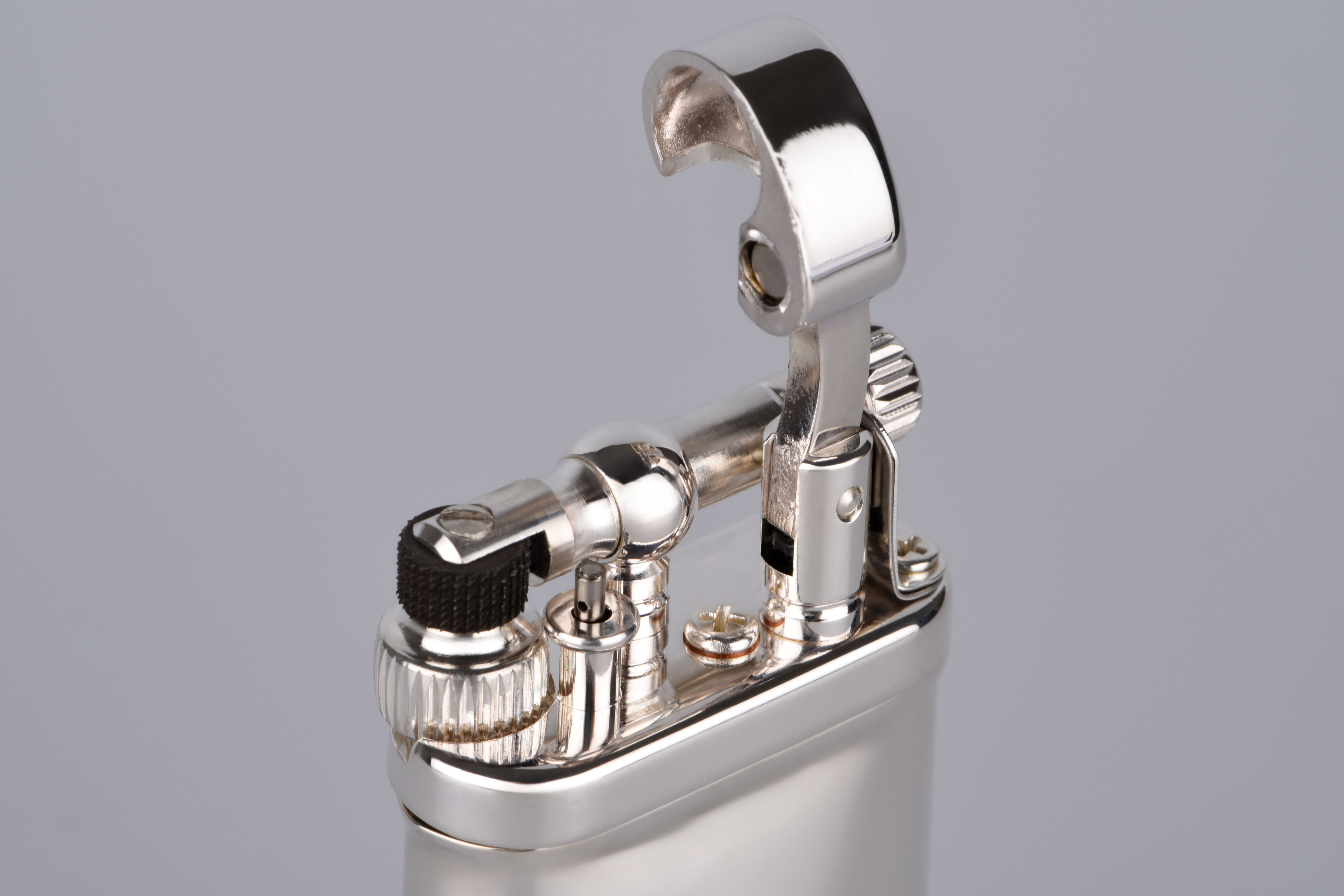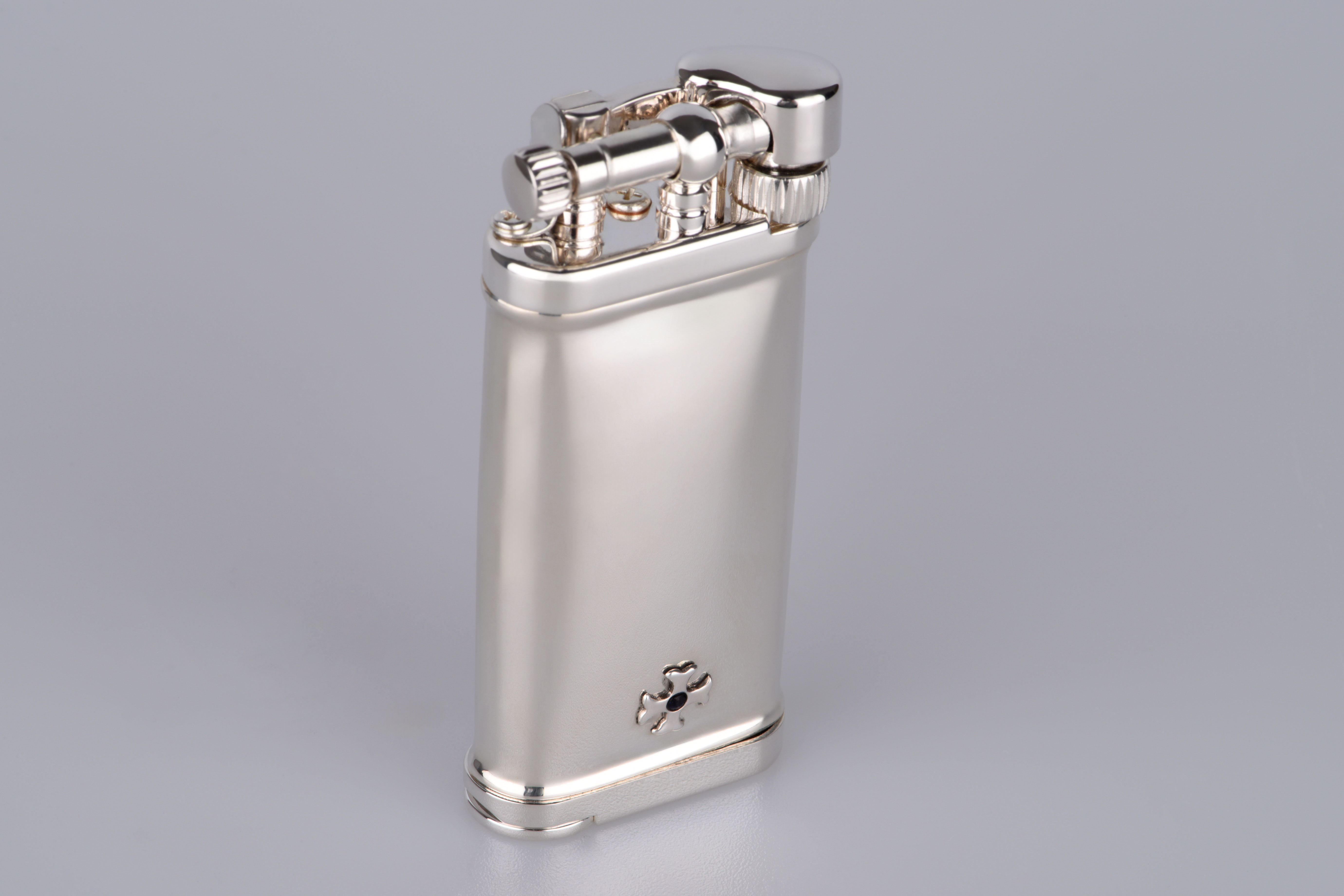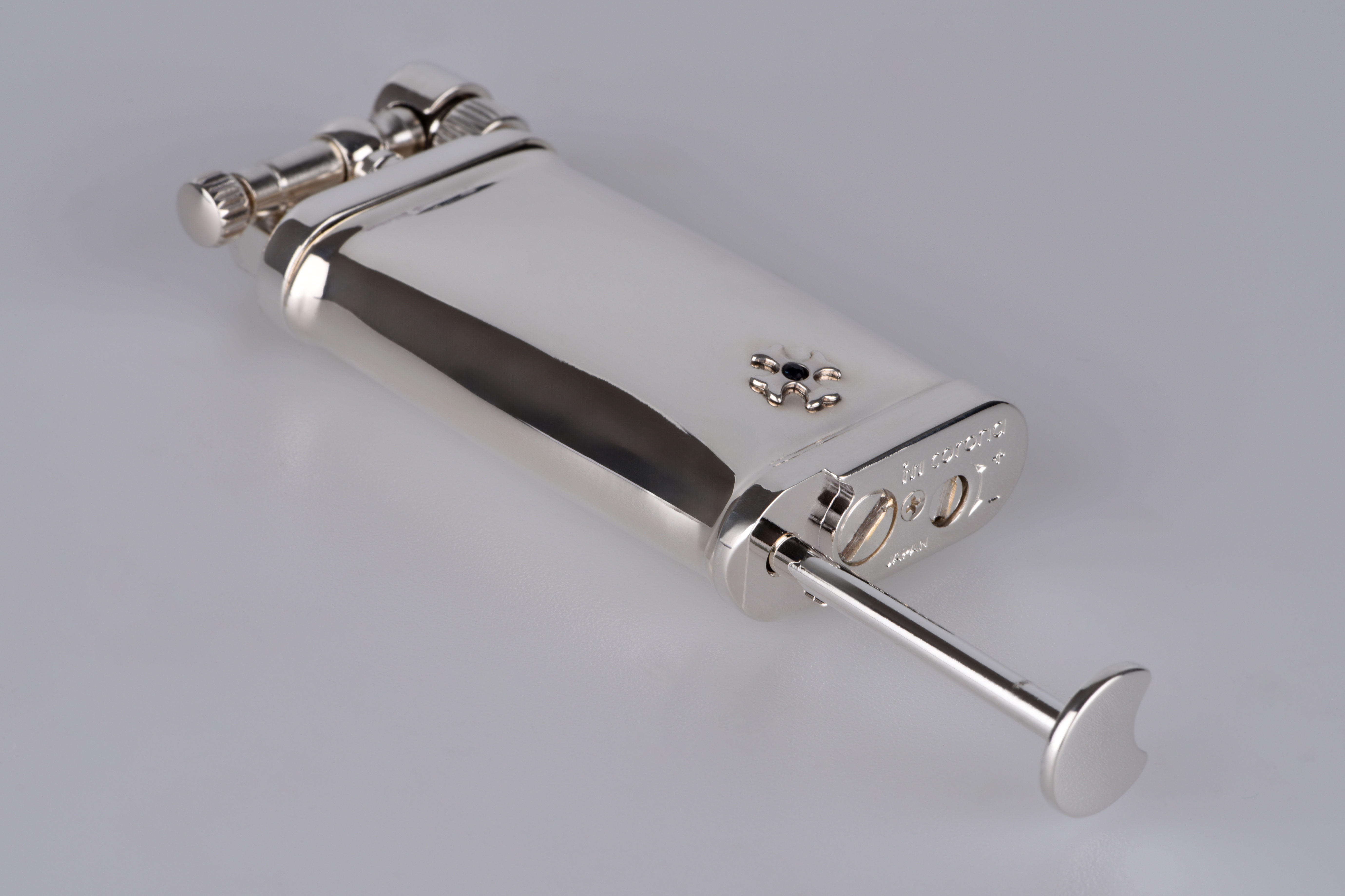 Mit seinen kompakten Maßen von 6,5 x 3 cm und einem angenehmen Gewicht von 85 Gramm liegt es spürbar edel in der Hand. Jeder Griff, jedes Klicken des Mechanismus ist eine Hommage an die große Kunst der traditionellen Feuerzeugfertigung. Die aufwendig starkversilberte Corona-Mechanik sorgt für einen geschmeidigen Zündvorgang – zuverlässig, präzise, mit einem Hauch Nostalgie.