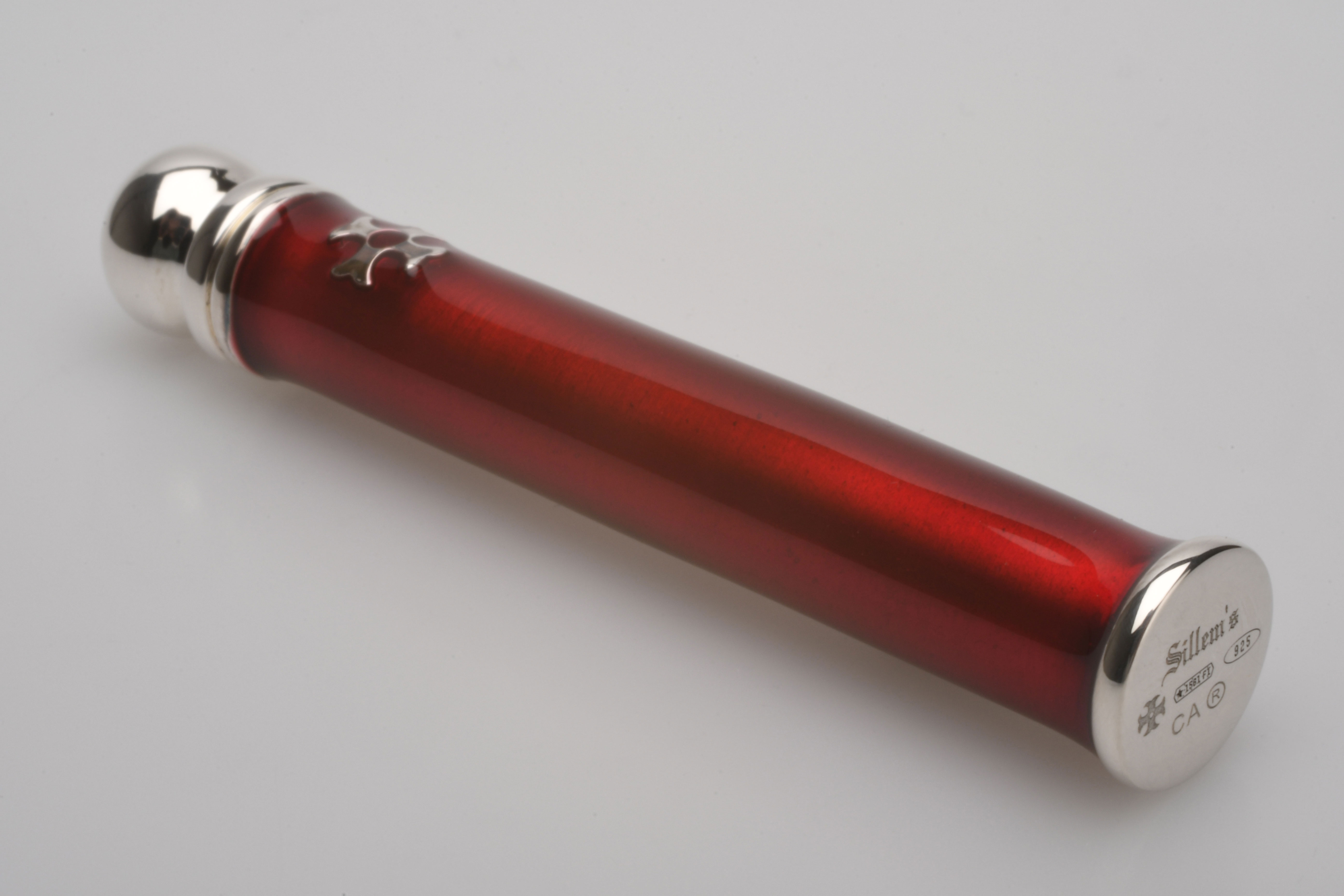 Gefertigt aus hochwertigem 925er Sterling Silber, strahlt dieser Pfeifenstopfer eine unvergleichliche Brillanz und Wertigkeit aus. Die feine, kühle rote Emaille verleiht ihm einen lebendigen Farbakzent, der das klassische Silber perfekt ergänzt und dem Stopfer eine einzigartige Note gibt.
