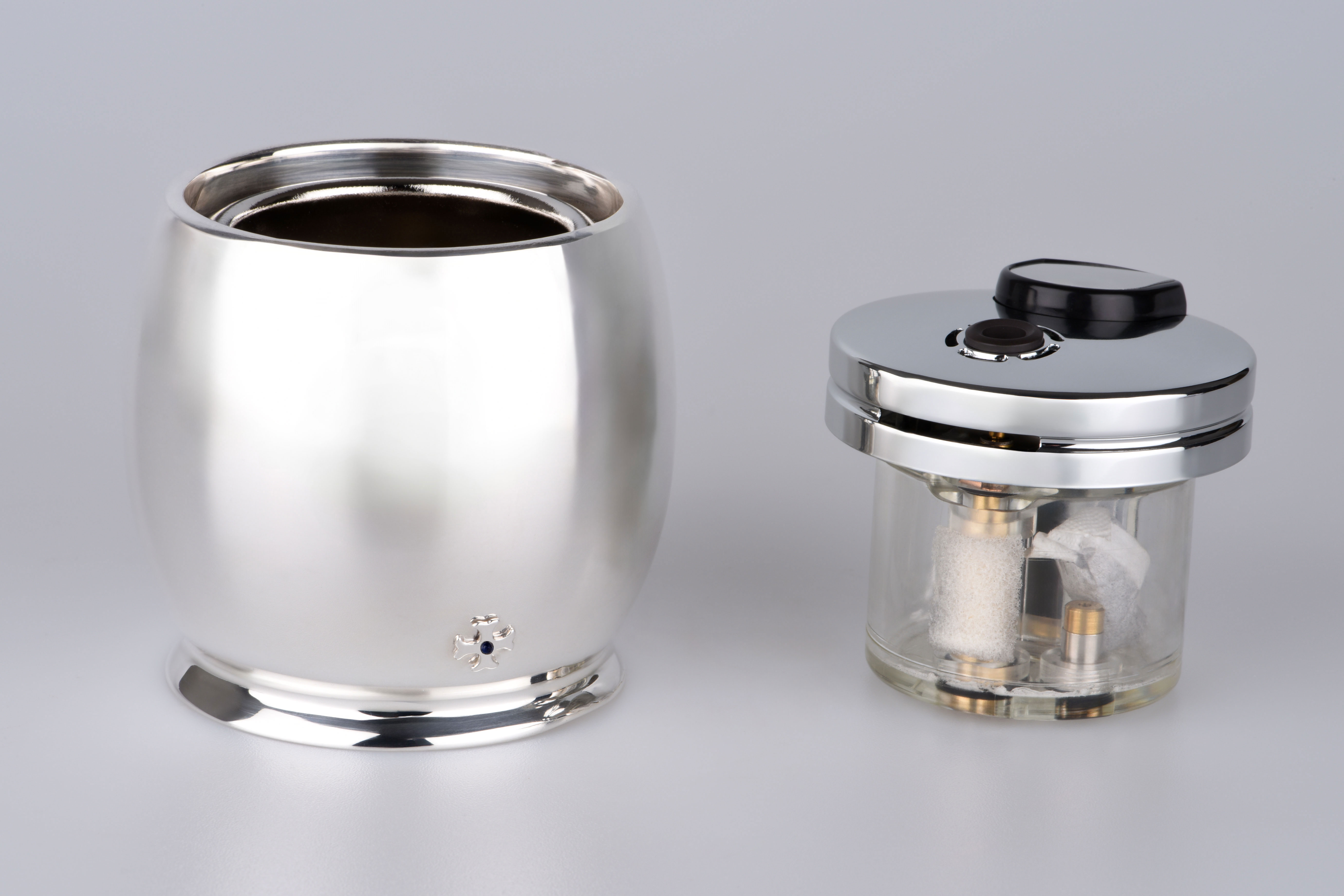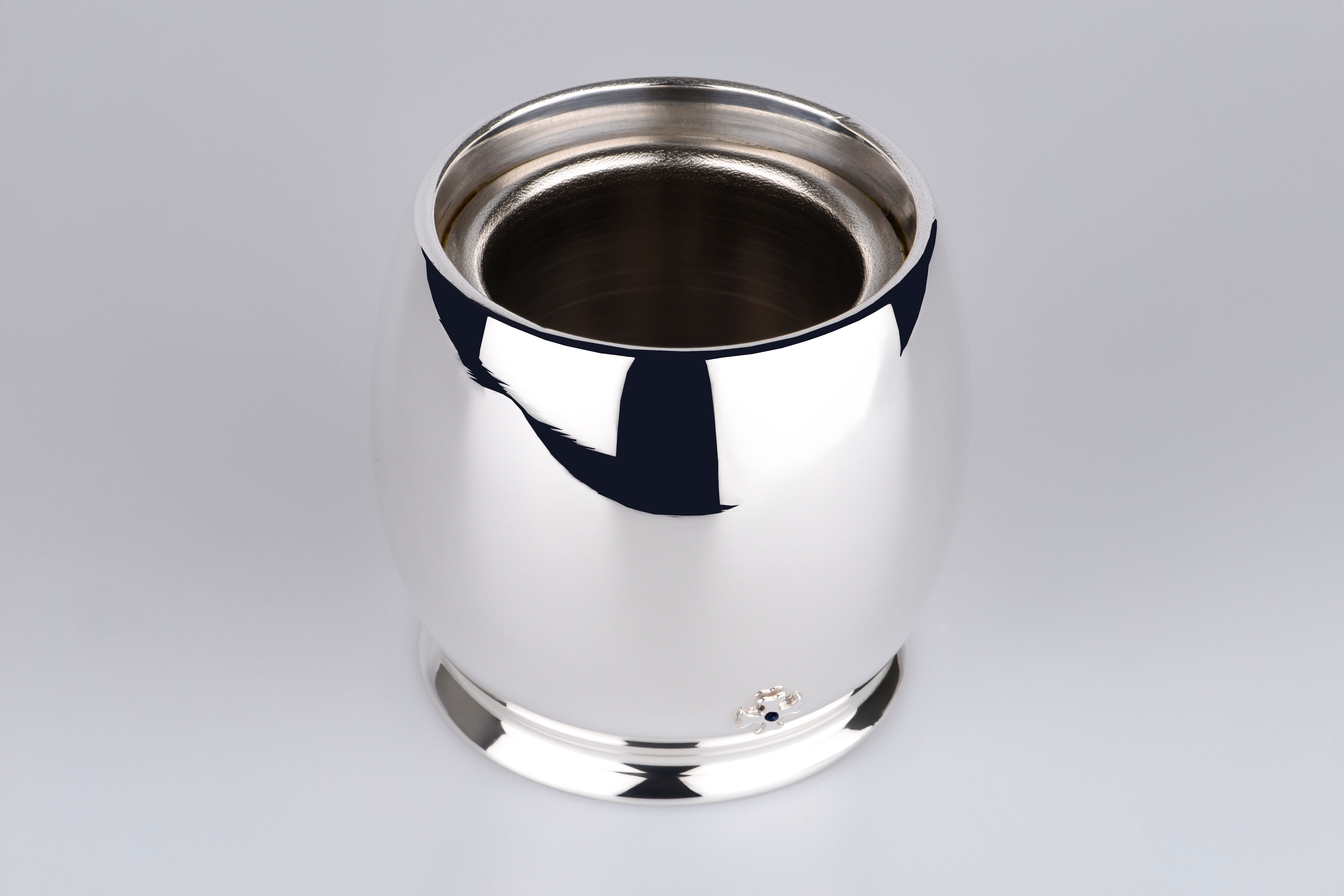 Mit seinem Durchmesser von 6 cm, einer Höhe von 7,5 cm und einem soliden Gewicht von 560 Gramm liegt es schwer in der Hand – im besten Sinne. Es versprüht nicht nur Flammen, sondern auch Wertigkeit, Würde und Beständigkeit. Das glänzende, fein polierte Silber fängt das Licht ein wie ein altes Erbstück und erzählt seine eigene Geschichte – auch wenn es gerade erst in Ihre Hände gelangt.