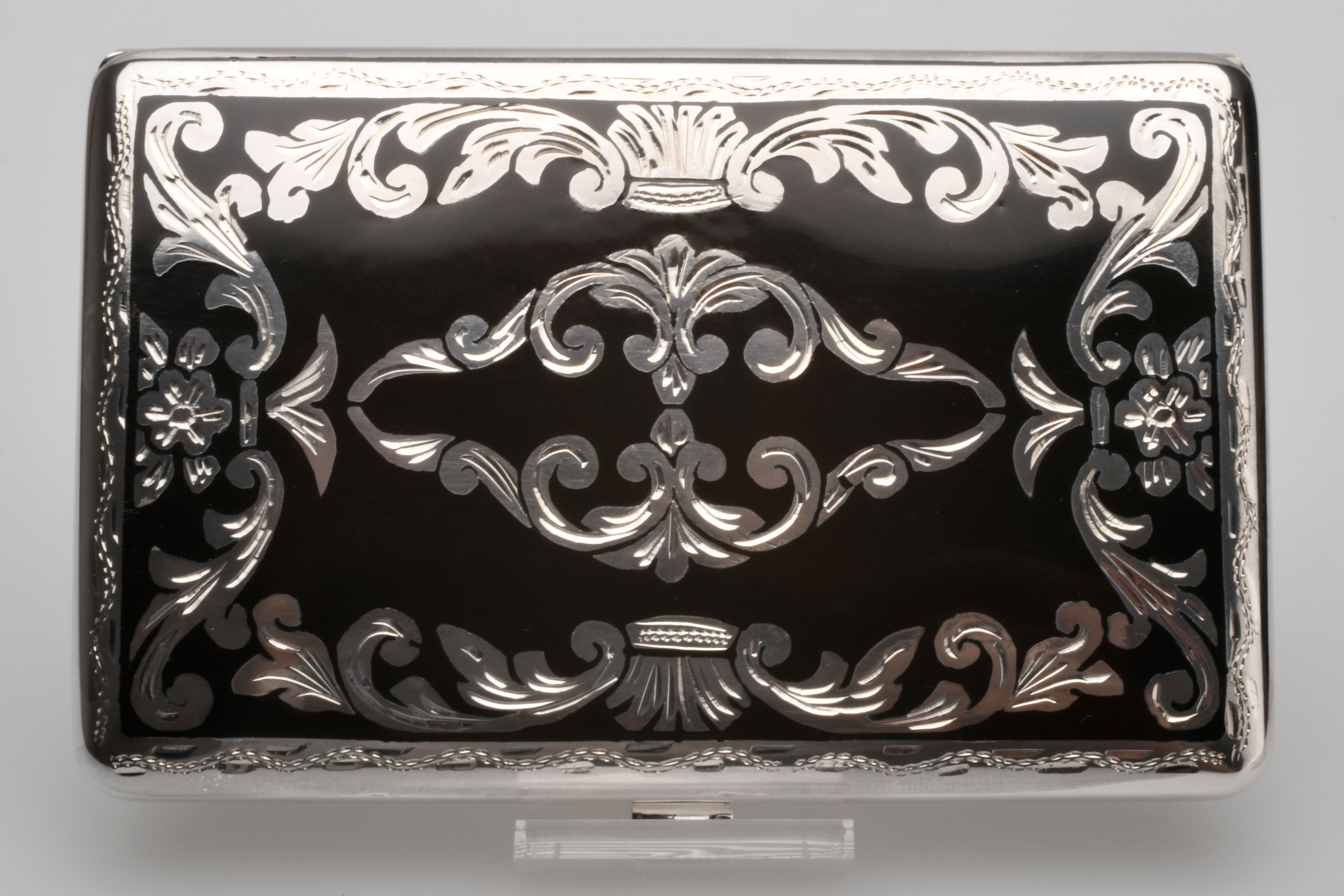 Erleben Sie das Besondere. Spüren Sie die Verbindung zwischen Tradition und Moderne. Tragen Sie ein Stück Kunst in Ihrer Tasche – mit Sillem’s handgraviertem Zigarettenetui aus Sterling Silber und schwarzer Emaille.