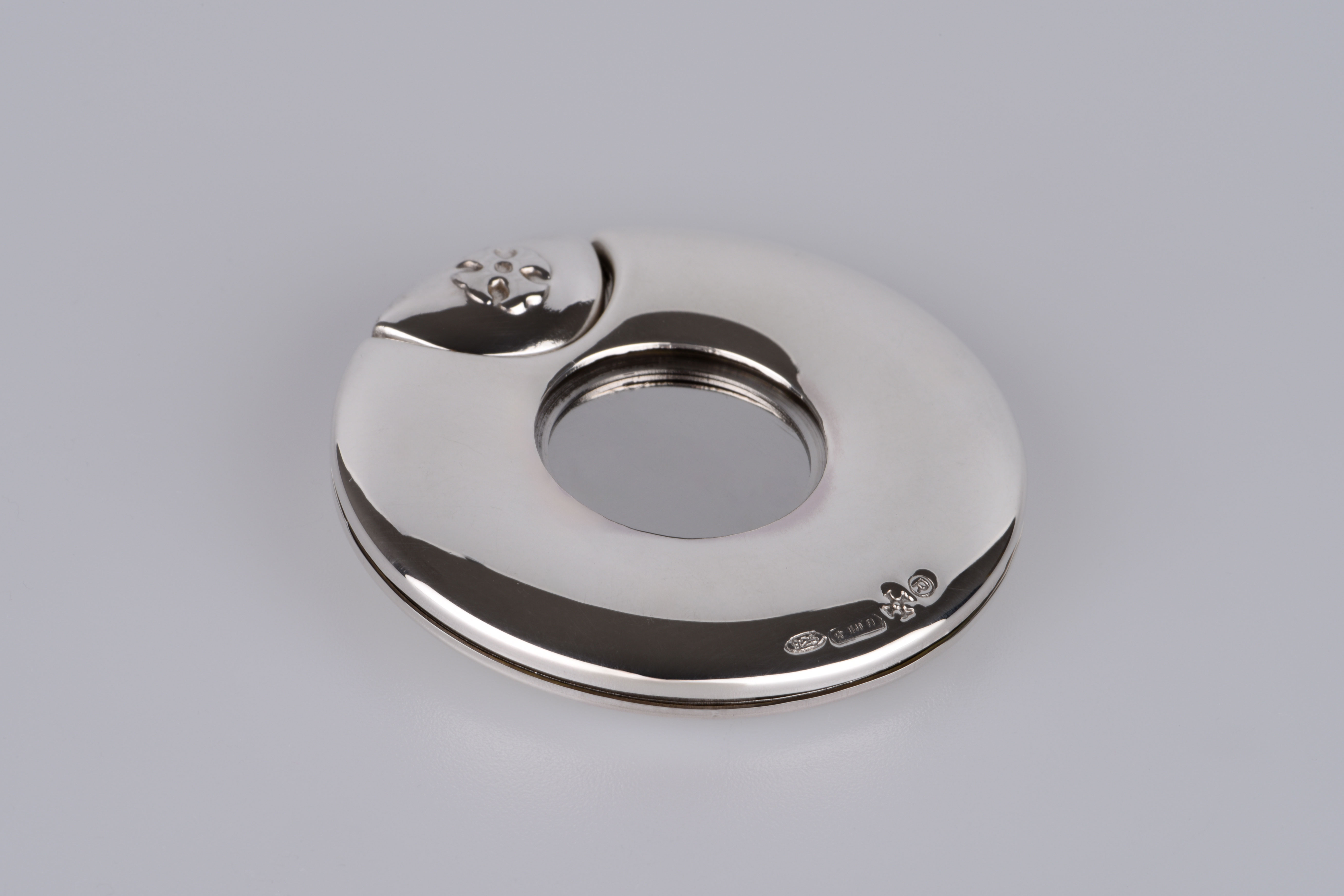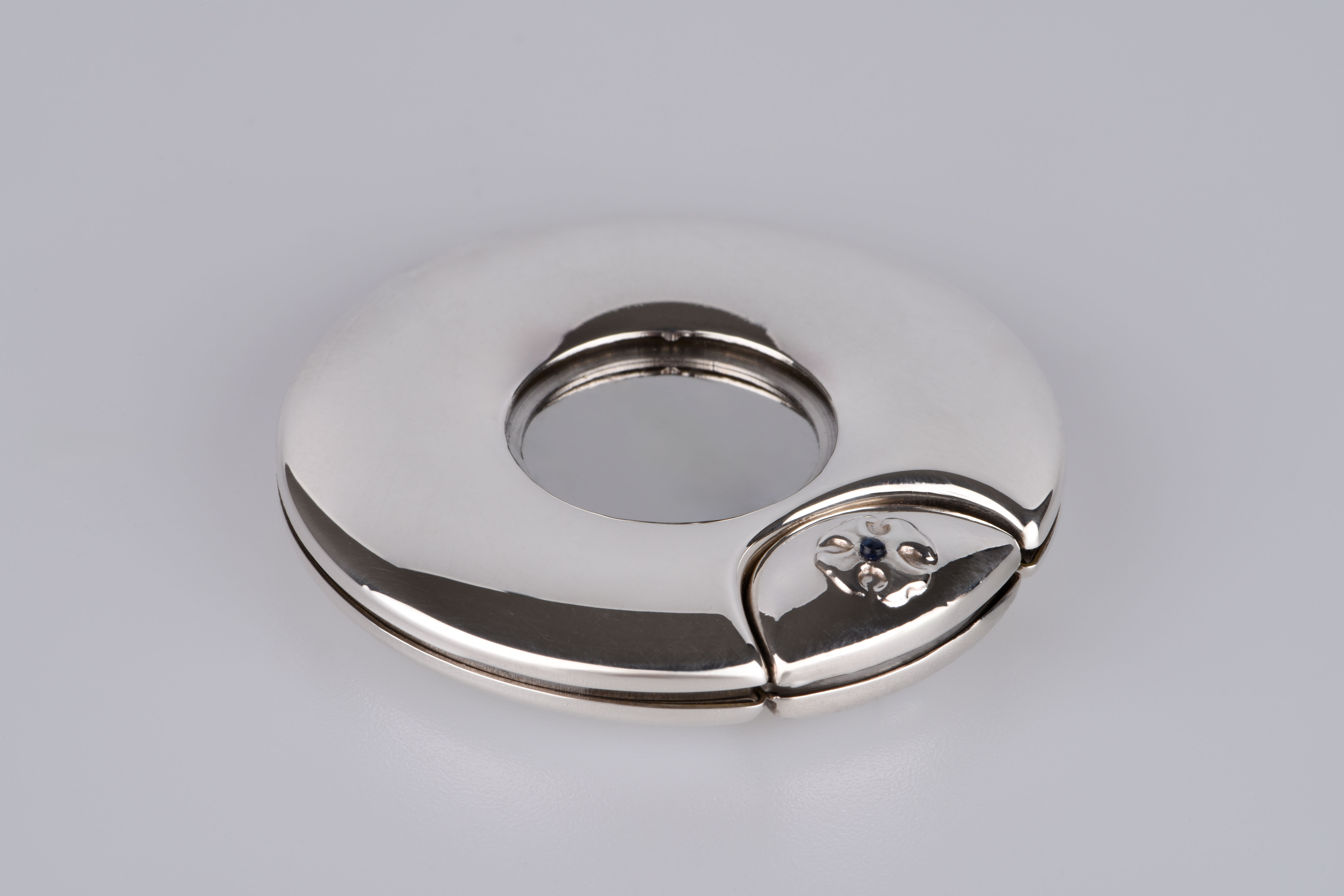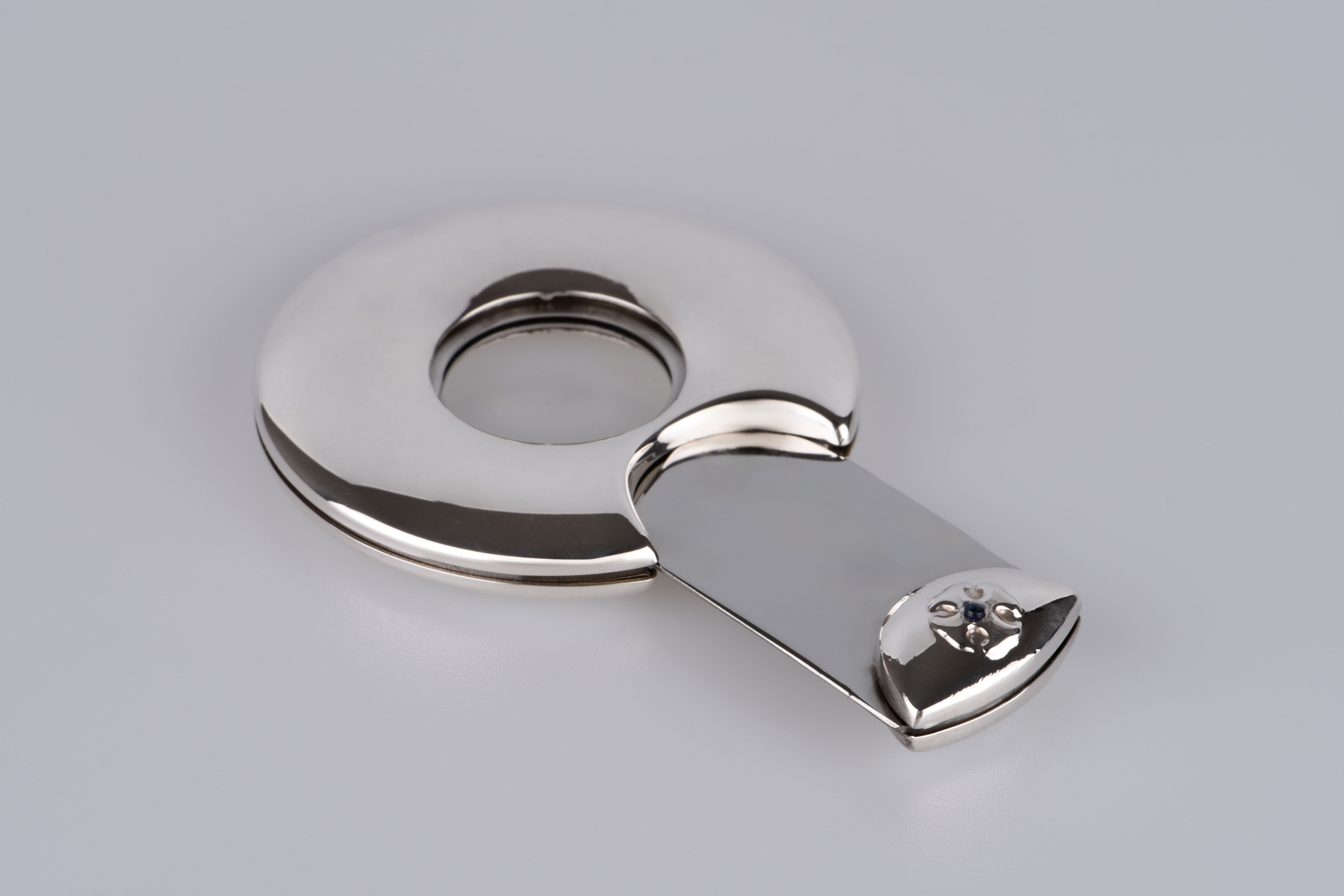 Gefertigt aus edlem 925er Sterling Silber, strahlt dieser Zigarrenabschneider nicht nur Luxus aus, sondern fühlt sich auch in der Hand unwiderstehlich wertvoll an. Mit einem Durchmesser von 5,5 cm liegt er perfekt in der Hand, während das 2 cm breite Schneideloch jede Zigarre mit höchster Präzision und Souveränität empfängt.